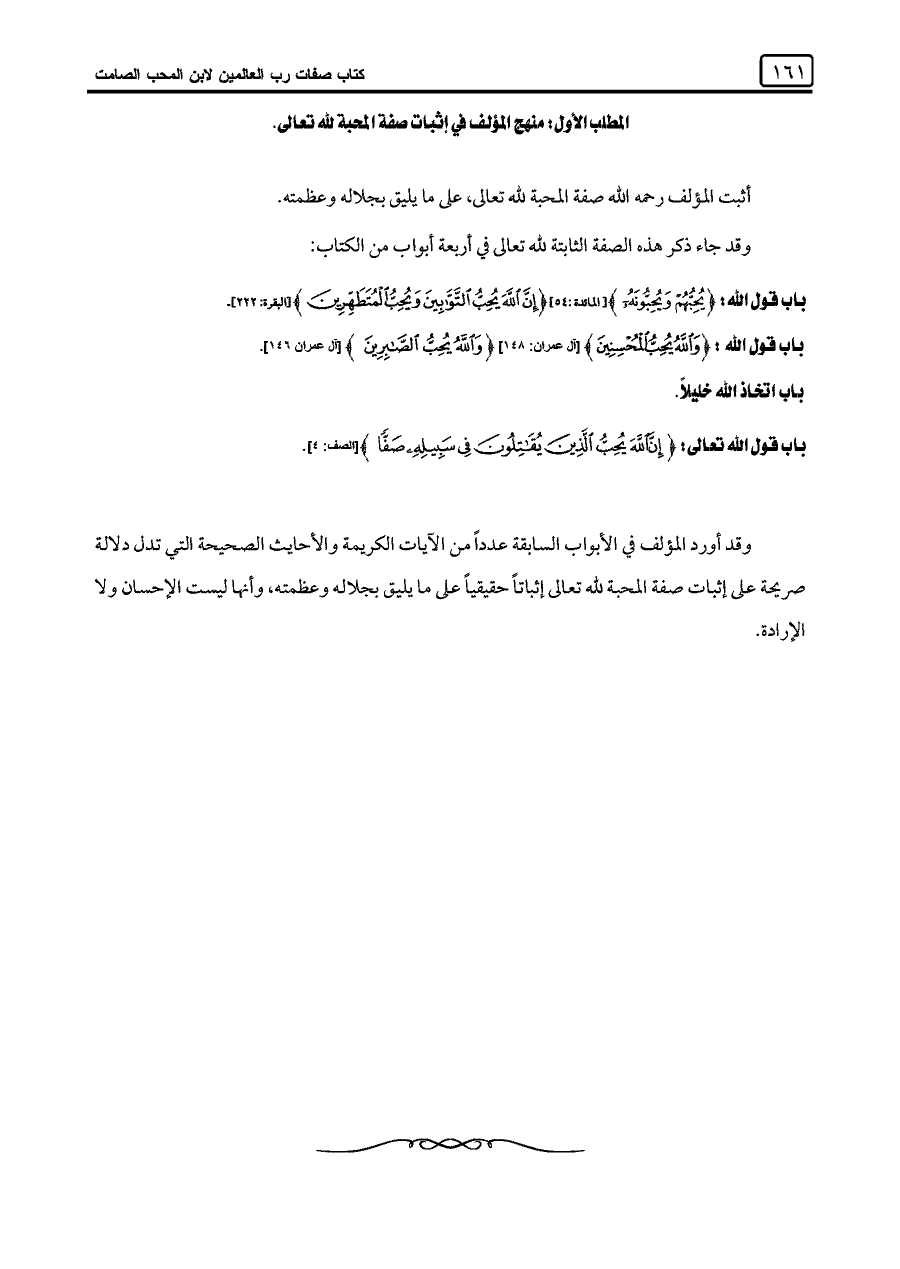وقد أورد المؤلف في الأبواب السابقة عددًا من الآيات الكريمة والأحايث الصحيحة التي تدل دلالة صريحة على إثبات صفة المحبة للَّه تعالى إثبات حقيقية على ما يليق بجلاله وعظمته، وأنها ليست الإحسان ولا الإرادة.