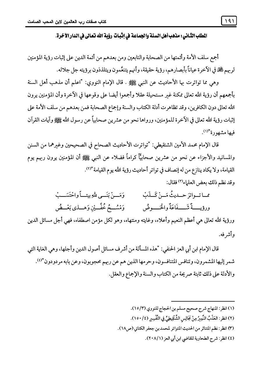 قال الإمام محمد الأمين الشنقيطي: "تواترت الأحاديث الصحاح في الصحيحين وغيرهما من السنن والمسانيد والأجزاء عن نحو من عشرين صحابيًّا كرامة فضلاء عن النبي -صلى اللَّه عليه وسلم-، أن المؤمنين يرون ربهم يوم القيامة، ولا يكاد ينازع من له إنصاف في تواتر أحاديث رؤية اللَّه يوم القيامة" (¬٢).