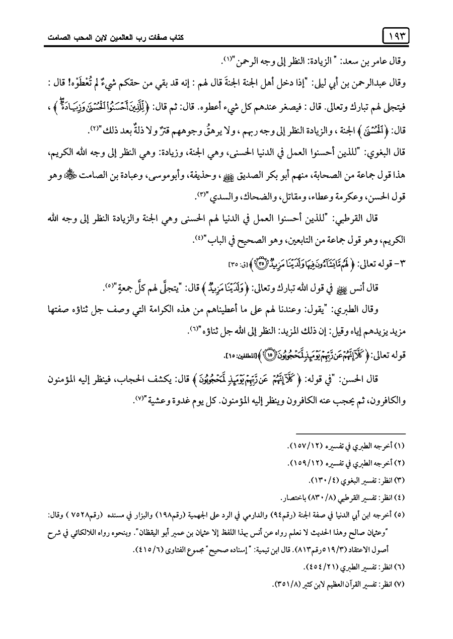 وقال عامر بن سعد: "الزيادة: النظر إلى وجه الرحمن" (¬١).