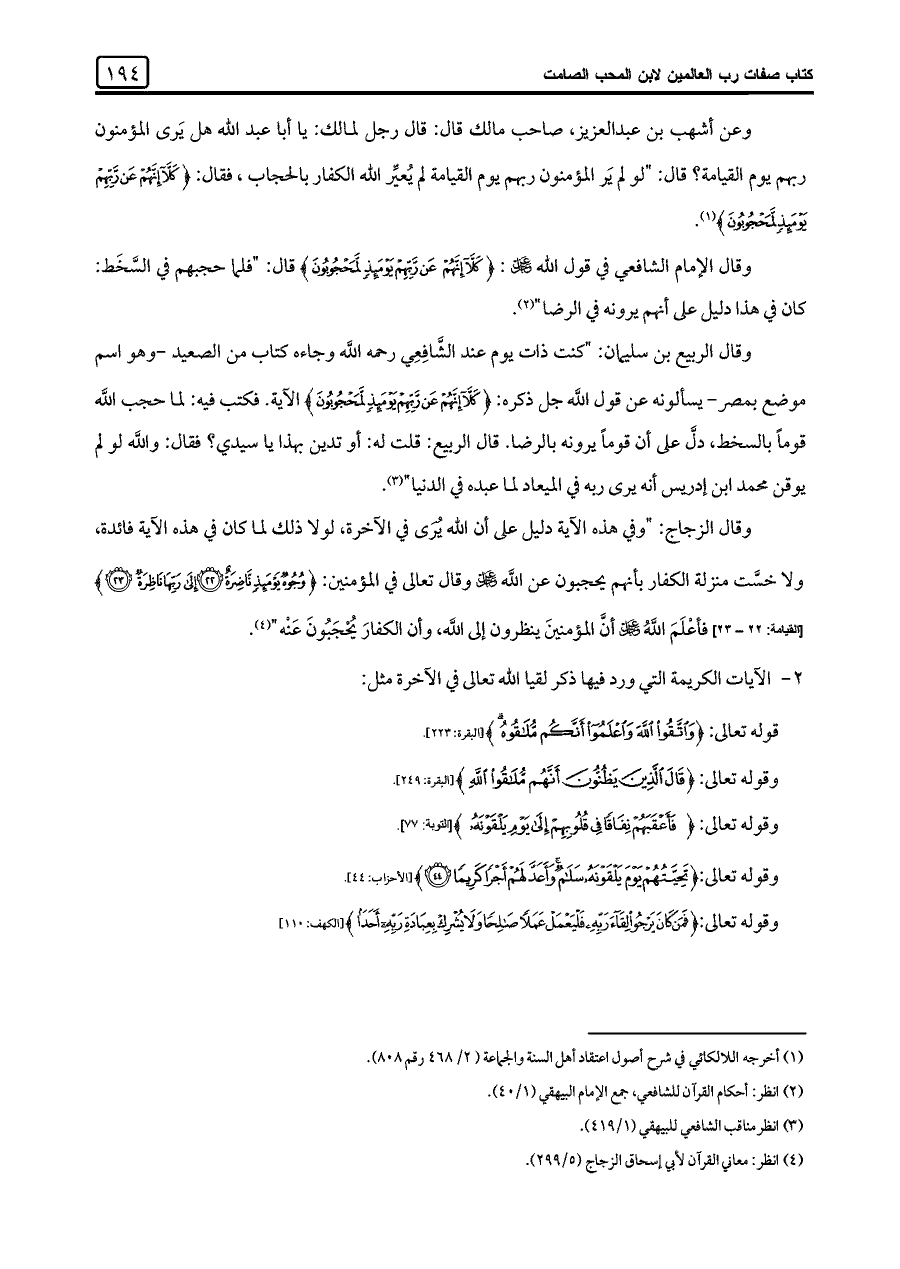 وقال الربيع بن سليمان: "كنت ذات يوم عند الشَّافِعِي رحمه اللَّه وجاءه كتاب من الصعيد -وهو اسم موضع بمصر- يسألونه عن قول اللَّه جل ذكره: {كَلَّا إِنَّهُمْ عَنْ رَبِّهِمْ يَوْمَئِذٍ لَمَحْجُوبُونَ} الآية. فكتب فيه: لما حجب اللَّه قومًا بالسخط، دلَّ على أن قومًا يرونه بالرضا. قال الربيع: قلت له: أو تدين بهذا يا سيدي؟ فقال: واللَّه لو لم يوقن محمد ابن إدريس أنه يرى ربه في الميعاد لما عبده في الدنيا" (¬٣).