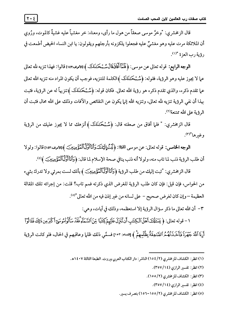 الوجه الخامس: قوله تعالى: عن موسى عليه السلام: {تُبْتُ إِلَيْكَ وَأَنَا أَوَّلُ الْمُؤْمِنِينَ} [الأعراف: ١٤٣] قالوا: ولولا أن طلب الرؤية ذنب لما تاب منه، ولولا أنه ذنب ينافي صحة الإسلام لما قال: {وَأَنَا أَوَّلُ الْمُؤْمِنِينَ} (¬٤).