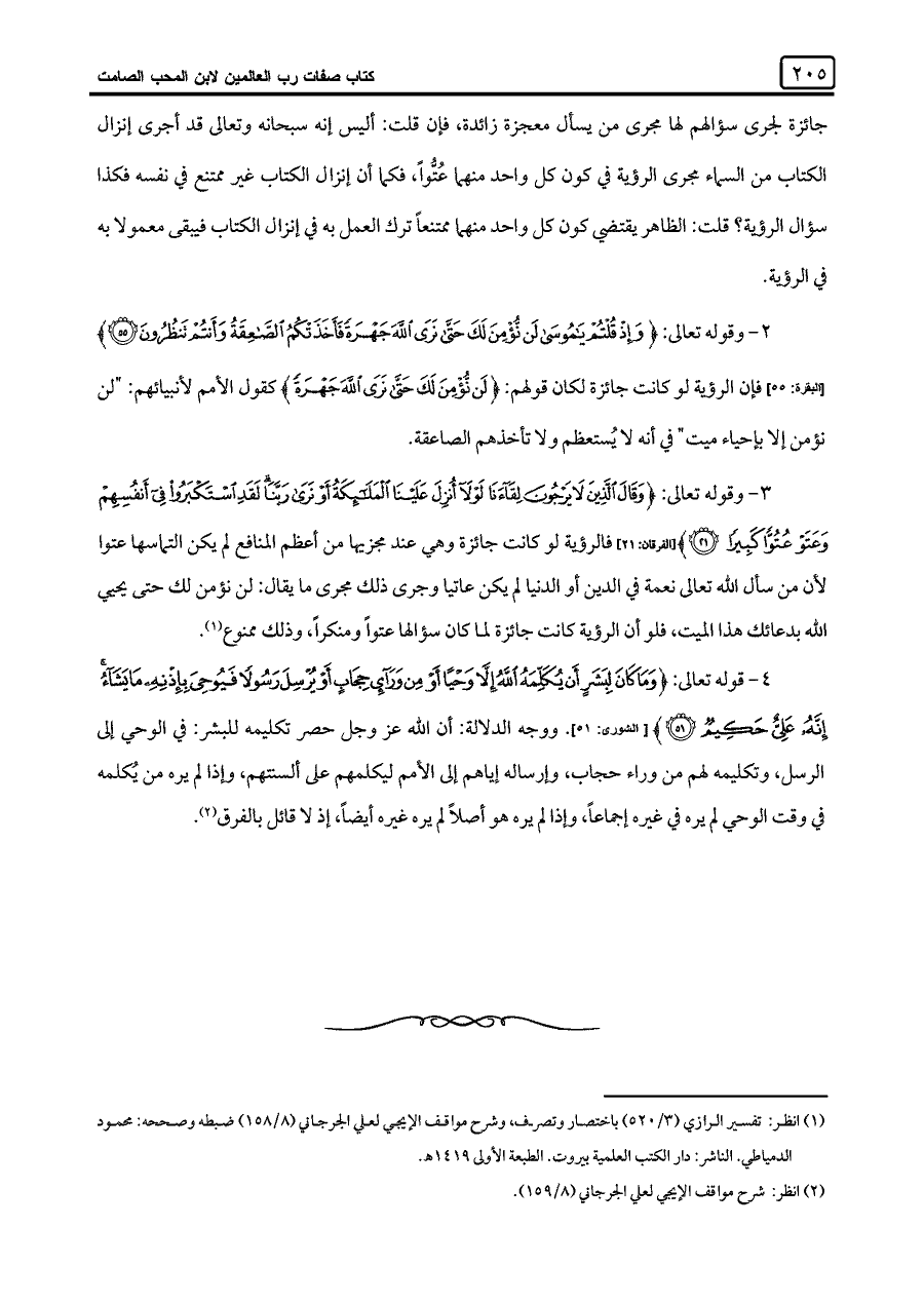 ٣ - وقوله تعالى: {وَقَالَ الَّذِينَ لَا يَرْجُونَ لِقَاءَنَا لَوْلَا أُنْزِلَ عَلَيْنَا الْمَلَائِكَةُ أَوْ نَرَى رَبَّنَا لَقَدِ اسْتَكْبَرُوا فِي أَنْفُسِهِمْ وَعَتَوْا عُتُوًّا كَبِيرًا (٢١)} [الفرقان: ٢١] فالرؤية لو كانت جائزة وهي عند مجزيها من أعظم المنافع لم يكن التماسها عتوا لأن من سأل اللَّه تعالى نعمة في الدين أو الدنيا لم يكن عاتيا وجرى ذلك مجرى ما يقال: لن نؤمن لك حتى يحيي اللَّه بدعائك هذا الميت، فلو أن الرؤية كانت جائزة لما كان سؤالها عتوًا ومنكرًا، وذلك ممنوع (¬١).
