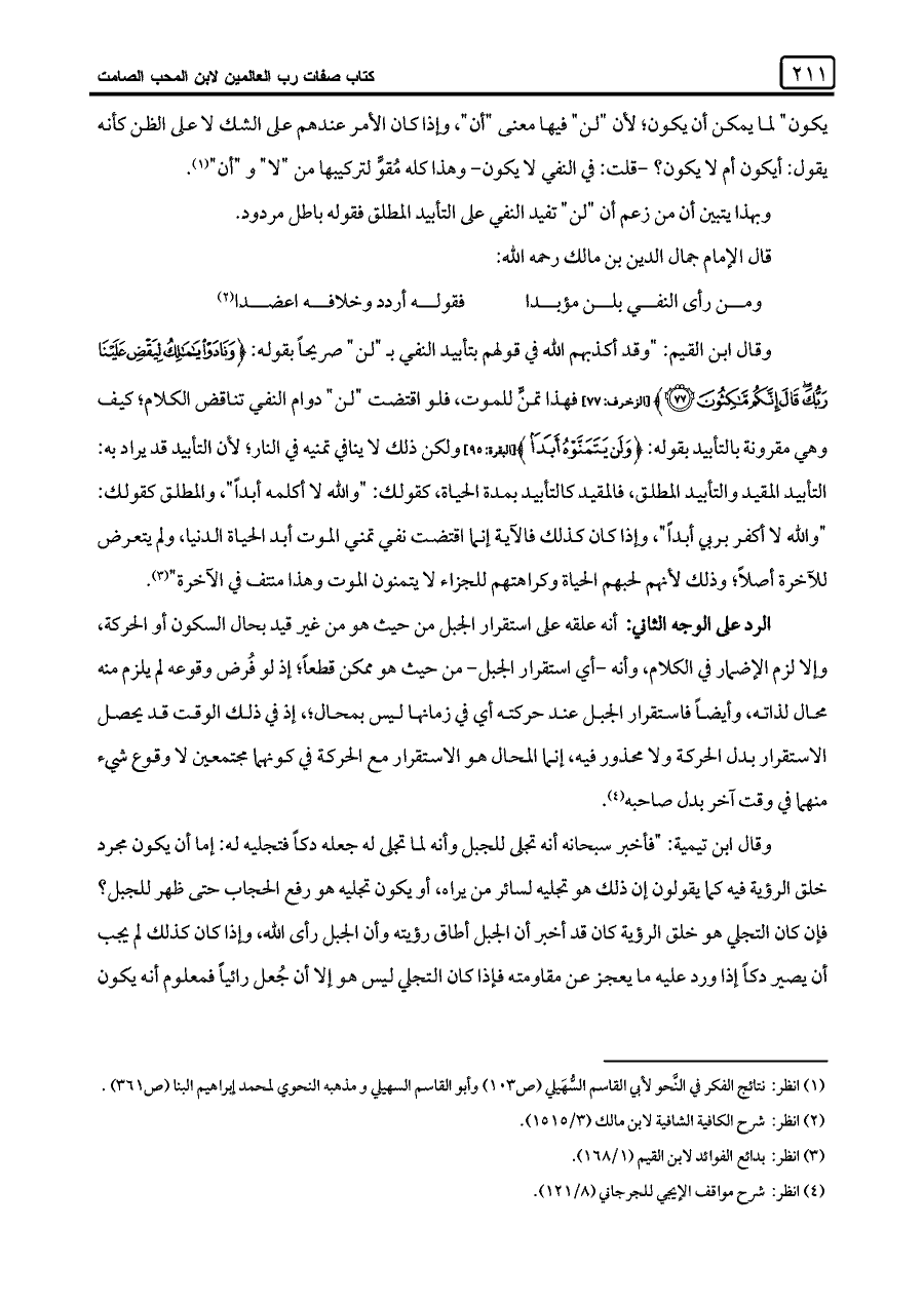 وقال ابن القيم: "وقد أكذبهم اللَّه في قولهم بتأبيد النفي بـ "لن" صريحًا بقوله: {وَنَادَوْا يَامَالِكُ لِيَقْضِ عَلَيْنَا رَبُّكَ قَالَ إِنَّكُمْ مَاكِثُونَ (٧٧)} [الزخرف: ٧٧] فهذا تمنٍّ للموت، فلو اقتضت "لن" دوام النفي تناقض الكلام؛ كيف وهي مقرونة بالتأبيد بقوله: {وَلَنْ يَتَمَنَّوْهُ أَبَدًا} [البقرة: ٩٥] ولكن ذلك لا ينافي تمنيه في النار؛ لأن التأبيد قد يراد به: التأبيد المقيد والتأبيد المطلق، فالمقيد كالتأبيد بمدة الحياة، كقولك: "واللَّه لا أكلمه أبدًا"، والمطلق كقولك: "واللَّه لا أكفر بربي أبدًا"، وإذا كان كذلك فالآية إنما اقتضت نفي تمني الموت أبد الحياة الدنيا، ولم يتعرض للآخرة أصلًا؛ وذلك لأنهم لحبهم الحياة وكراهتهم للجزاء لا يتمنون الموت وهذا منتف في الآخرة" (¬٣).