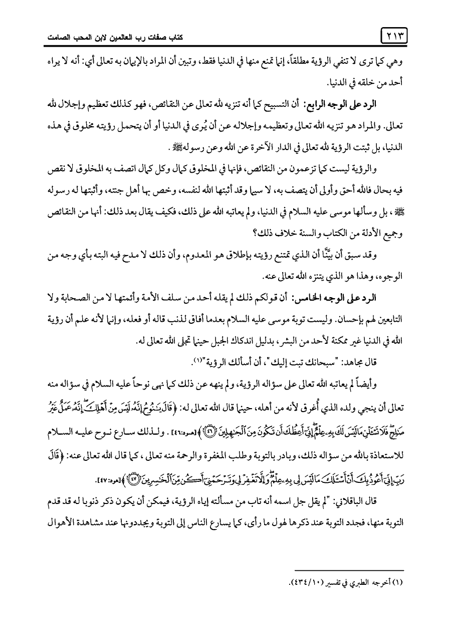 الرد على الوجه الخامس: أن قولكم ذلك لم يقله أحد من سلف الأمة وأئمتها لا من الصحابة ولا التابعين لهم بإحسان. وليست توبة موسى عليه السلام بعدما أفاق لذنب قاله أو فعله، وإنما لأنه علم أن رؤية اللَّه في الدنيا غير ممكنة لأحد من البشر، بدليل اندكاك الجبل حينما تجلى اللَّه تعالى له.