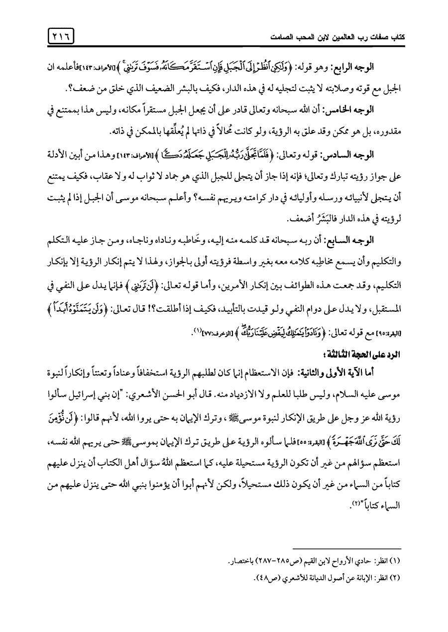 الوجه السابع: أن ربه سبحانه قد كلمه منه إليه، وخَاطبه وناداه وناجاه، ومن جاز عليه التكلم والتكليم وأن يسمع مخاطِبه كلامه معه بغير واسطة فرؤيته أولى بالجواز، ولهذا لا يتم إنكار الرؤية إلا بإنكار التكليم، وقد جمعت هذه الطوائف بين إنكار الأمرين، وأما قوله تعالى: {لَنْ تَرَانِي} فإنما يدل على النفي في المستقبل، ولا يدل على دوام النفي ولو قيدت بالتأبيد، فكيف إذا أطلقت؟! قال تعالى: {وَلَنْ يَتَمَنَّوْهُ أَبَدًا} [البقرة: ٩٥] مع قوله تعالى: {وَنَادَوْا يَامَالِكُ لِيَقْضِ عَلَيْنَا رَبُّكَ} [الزخرف: ٧٧] (¬١).