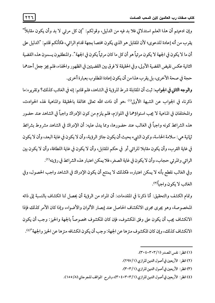 وإن ادعيتم أن هذا العلم استدلالي فلا بد فيه من الدليل، وقولكم: "إن كل مرئي لا بد وأن يكون مقابلًا" يقرب من أنه إعادة للدعوى؛ لأن المقابل هو الذي يكون مختصًا بجهة قدام الرائي، فكأنكم قلتم: "الدليل على أن ما لا يكون في الجهة لا يكون مرئية هو أن كل ما كان مرئية يكون في الجهة". والمنطقيون يسمون هذه القضية الثانية عكس نقيض القضية الأولى، وفي الحقيقة لا فرق بين القضيتين في الظهور والخفاء، فلم يجز جعل أحدهما حجة في صحة الأخرى، بل يقرب هذا من أن يكون إعادة المطلوب بعبارة أخرى.