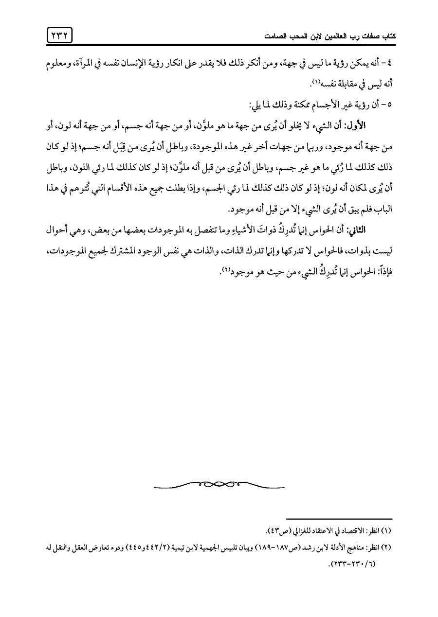 ٤ - أنه يمكن رؤية ما ليس في جهة، ومن أنكر ذلك فلا يقدر على انكار رؤية الإنسان نفسه في المرآة، ومعلوم أنه ليس في مقابلة نفسه (¬١).