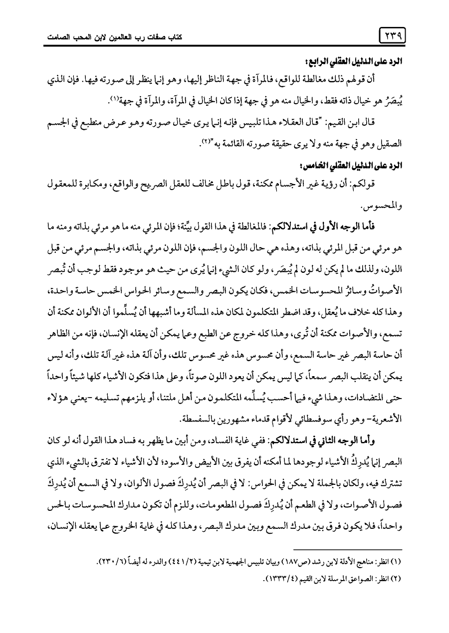 فأما الوجه الأول في استدلالكم: فالمغالطة في هذا القول بيِّنة؛ فإن المرئي منه ما هو مرئي بذاته ومنه ما هو مرئي من قبل المرئي بذاته، وهذه هي حال اللون والجسم، فإن اللون مرئي بذاته، والجسم مرئي من قبل اللون، ولذلك ما لم يكن له لون لم يُبصَر، ولو كان الشيء إنما يُرى من حيث هو موجود فقط لوجب أن تُبصر الأصواتُ وسائرُ المحسوسات الخمس، فكان يكون البصر والسمع وسائر الحواس الخمس حاسة واحدة، وهذا كله خلاف ما يُعقل، وقد اضطر المتكلمون لمكان هذه المسألة وما أشبهها أن يُسلِّموا أن الألوان ممكنة أن تسمع، والأصوات ممكنة أن تُرى، وهذا كله خروج عن الطبع وعما يمكن أن يعقله الإنسان، فإنه من الظاهر أن حاسة البصر غير حاسة السمع، وأن محسوس هذه غير محسوس تلك، وأن آلة هذه غير آلة تلك، وأنه ليس يمكن أن ينقلب البصر سمعًا، كما ليس يمكن أن يعود اللون صوتًا، وعلى هذا فتكون الأشياء كلها شيئًا واحدًا حتى المتضادات، وهذا شيء فيها أحسب يُسلِّمه المتكلمون من أهل ملتنا، أو يلزمهم تسليمه -يعني هؤلاء الأشعرية- وهو رأي سوفسطائي لأقوام قدماء مشهورين بالسفسطة.