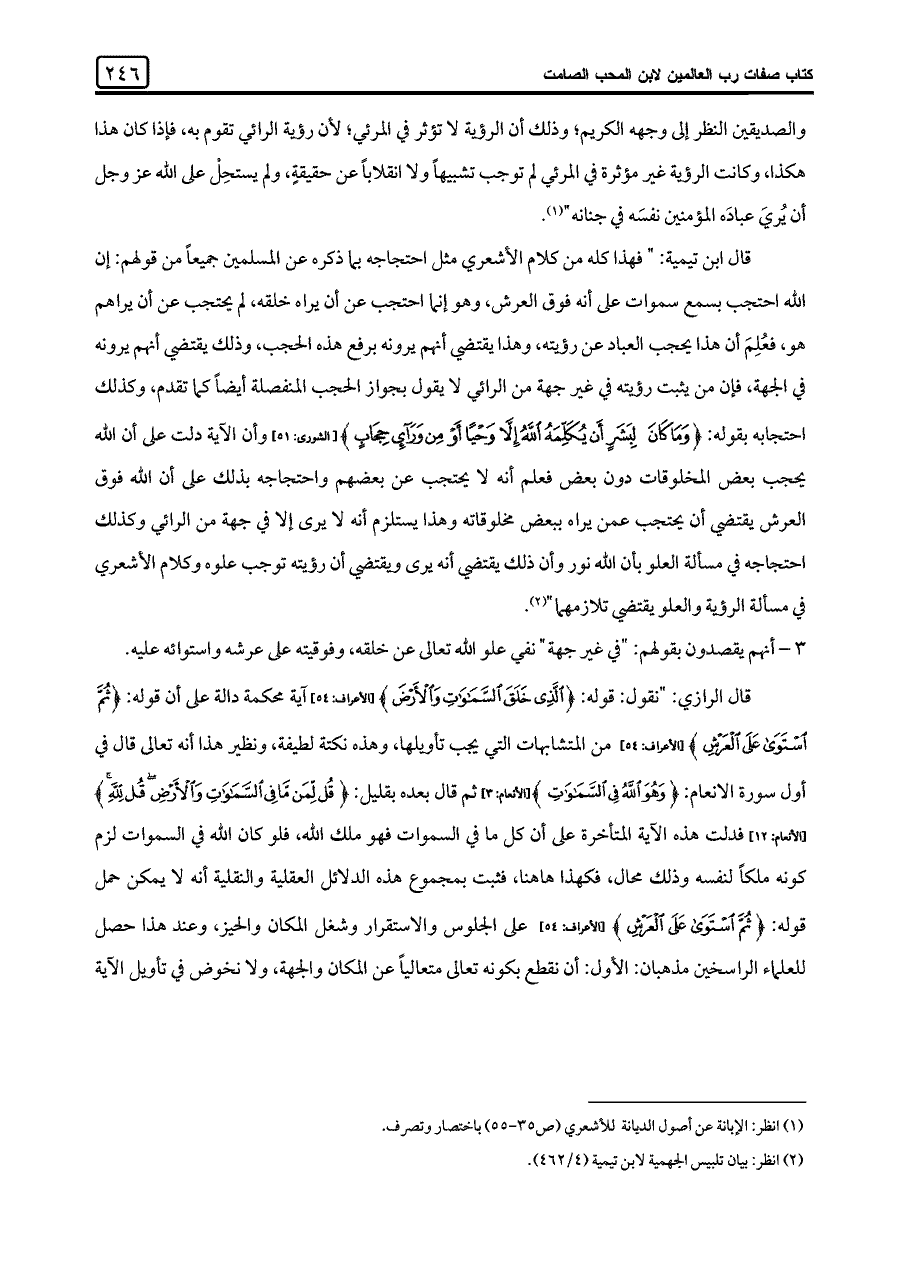 قال ابن تيمية: "فهذا كله من كلام الأشعري مثل احتجاجه بما ذكره عن المسلمين جميعًا من قولهم: إن اللَّه احتجب بسمع سموات على أنه فوق العرش، وهو إنما احتجب عن أن يراه خلقه، لم يحتجب عن أن يراهم هو، فعُلِمَ أن هذا يحجب العباد عن رؤيته، وهذا يقتضي أنهم يرونه برفع هذه الحجب، وذلك يقتضي أنهم يرونه في الجهة، فإن من يثبت رؤيته في غير جهة من الرائي لا يقول بجواز الحجب المنفصلة أيضًا كما تقدم، وكذلك احتجابه بقوله: {وَمَا كَانَ لِبَشَرٍ أَنْ يُكَلِّمَهُ اللَّهُ إِلَّا وَحْيًا أَوْ مِنْ وَرَاءِ حِجَابٍ} [الشورى: ٥١] وأن الآية دلت على أن اللَّه يحجب بعض المخلوقات دون بعض فعلم أنه لا يحتجب عن بعضهم واحتجاجه بذلك على أن اللَّه فوق العرش يقتضي أن يحتجب عمن يراه ببعض مخلوقاته وهذا يستلزم أنه لا يرى إلا في جهة من الرائي وكذلك احتجاجه في مسألة العلم بأن اللَّه نور وأن ذلك يقتضي أنه يرى ويقتضي أن رؤيته توجب علوه وكلام الأشعري في مسألة الرؤية والعلو يقتضي تلازمهما" (¬٢).