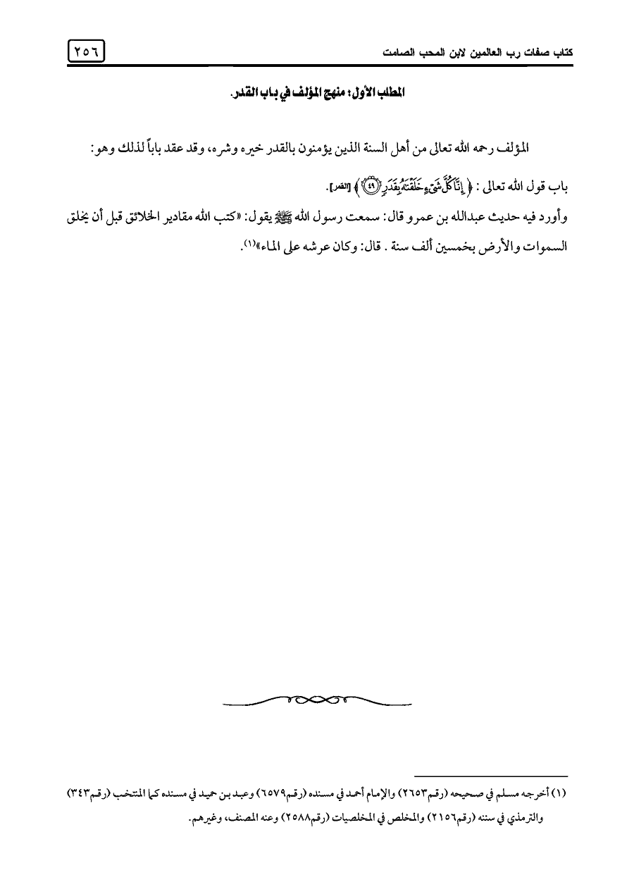 وأورد فيه حديث عبد اللَّه بن عمرو قال: سمعت رسول اللَّه -صلى اللَّه عليه وسلم-: يقول: "كتب اللَّه مقادير الخلائق قبل أن يخلق السموات والأرض بخمسين ألف سنة. قال: وكان عرشه على الماء" (¬١).