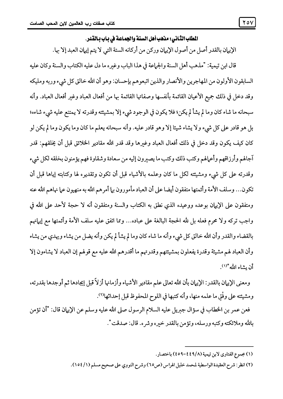 قال ابن تيمية: "مذهب أهل السنة والجماعة في هذا الباب وغيره ما دل عليه الكتاب والسنة وكان عليه السابقون الأولون من المهاجرين والأنصار والذين اتبعوهم بإحسان: وهو أن اللَّه خالق كل شيء وربه ومليكه وقد دخل في ذلك جميع الأعيان القائمة بأنفسها وصفاتها القائمة بها من أفعال العباد وغير أفعال العباد. وأنه سبحانه ما شاء كان وما لم يشأ لم يكن؛ فلا يكون في الوجود شيء إِلا بمشيئته وقدرته لا يمتنع عليه شيء شاءه؛ بل هو قادر على كل شيء ولا يشاء شيئًا إِلا وهو قادر عليه. وأنه سبحانه يعلم ما كان وما يكون وما لم يكن لو كان كيف يكون وقد دخل في ذلك أفعال العباد وغيرها وقد قدر اللَّه مقادير الخلائق قبل أن يخلقهم: قدر آجالهم وأرزاقهم وأعمالهم وكتب ذلك وكتب ما يصيرون إليه من سعادة وشقاوة فهم يؤمنون بخلقه لكل شيء وقدرته على كل شيء ومشيئته لكل ما كان وعلمه بالأشياء قبل أن تكون وتقديره لها وكتابته إياها قبل أن تكون. . . وسلف الأمة وأئمتها متفقون أيضًا على أن العباد مأمورون بما أمرهم اللَّه به منهيون عما نهاهم اللَّه عنه ومتفقون على الإيمان بوعده ووعيده الذي نطق به الكتاب والسنة ومتفقون أنه لا حجة لأحد على اللَّه في واجب تركه ولا محرم فعله بل اللَّه الحجة البالغة على عباده. . . ومما اتفق عليه سلف الأمة وأئمتها مع إيمانهم بالقضاء والقدر وأن اللَّه خالق كل شيء وأنه ما شاء كان وما لم يشأ لم يكن وأنه يضل من يشاء ويهدي من يشاء وأن العباد لهم مشيئة وقدرة يفعلون بمشيئتهم وقدرتهم ما أقدرهم اللَّه عليه مع قولهم إن العباد لا يشاءون إِلا أن يشاء اللَّه" (¬١).