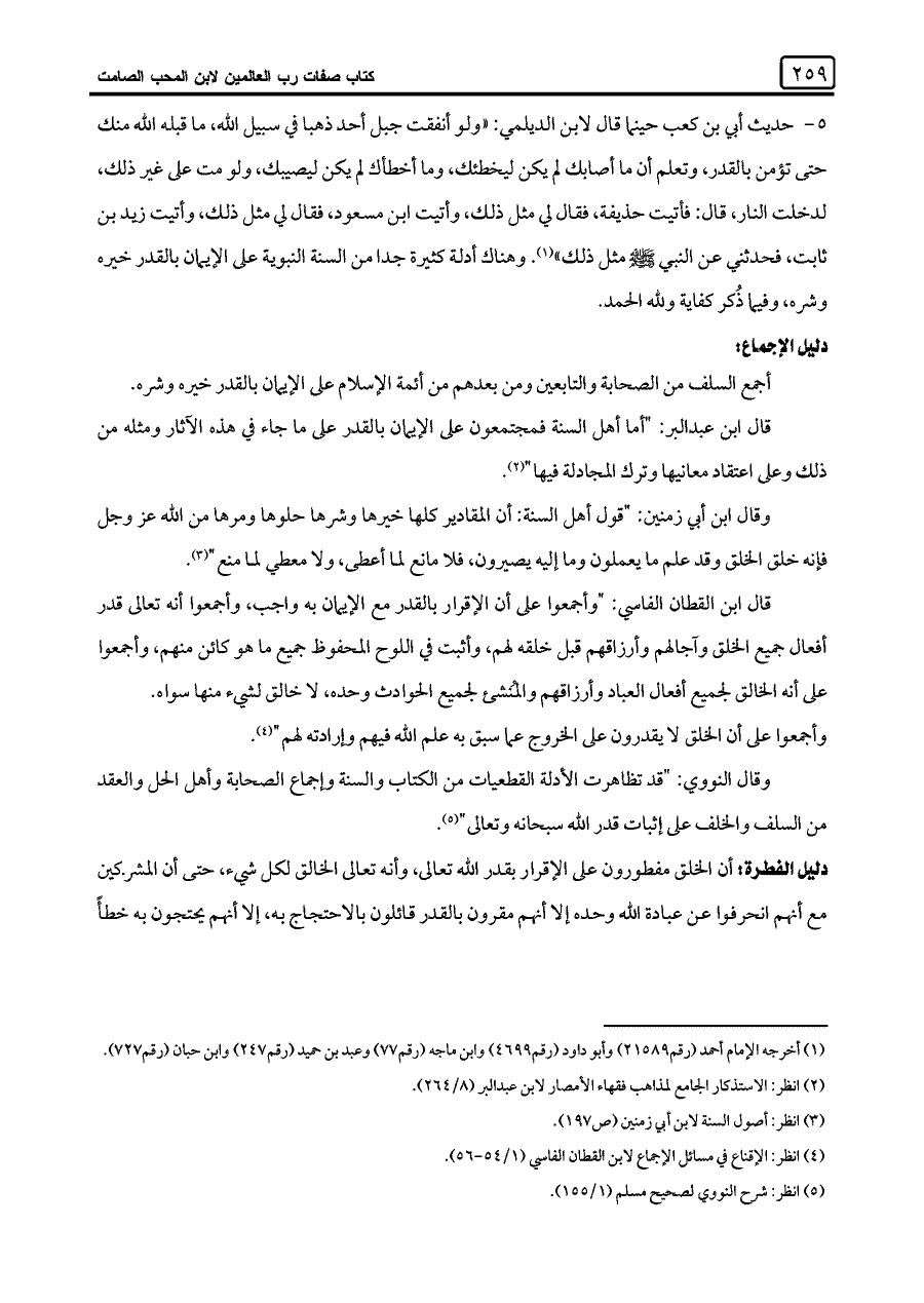 ٥ - حديث أبي بن كعب حينما قال لابن الديلمي: "ولو أنفقت جبل أحد ذهبا في سبيل اللَّه، ما قبله اللَّه منك حتى تؤمن بالقدر، وتعلم أن ما أصابك لم يكن ليخطئك، وما أخطأك لم يكن ليصيبك، ولو مت على غير ذلك، لدخلت النار، قال: فأتيت حذيفة، فقال لي مثل ذلك، وأتيت ابن مسعود، فقال لي مثل ذلك، وأتيت زيد بن ثابت، فحدثني عن النبي -صلى اللَّه عليه وسلم- مثل ذلك" (¬١). وهناك أدلة كثيرة جدا من السنة النبوية على الإيمان بالقدر خيره وشره، وفيما ذُكر كفاية وللَّه الحمد.