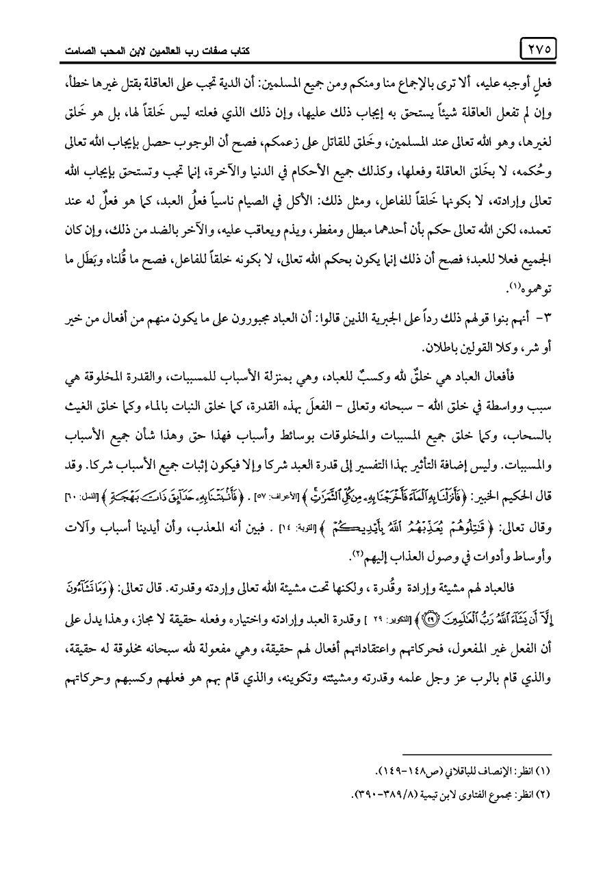 فأفعال العباد هي خلقٌ للَّه وكسبٌ للعباد، وهي بمنزلة الأسباب للمسببات، والقدرة المخلوقة هي سبب وواسطة في خلق اللَّه -سبحانه وتعالى- الفعل بهذه القدرة، كما خلق النبات بالماء وكما خلق الغيث بالسحاب، وكما خلق جميع المسببات والمخلوقات بوسائط وأسباب فهذا حق وهذا شأن جميع الأسباب والمسببات. وليس إضافة التأثير بهذا التفسير إلى قدرة العبد شركا وإلا فيكون إثبات جميع الأسباب شركا. وقد قال الحكيم الخبير: {فَأَنْزَلْنَا بِهِ الْمَاءَ فَأَخْرَجْنَا بِهِ مِنْ كُلِّ الثَّمَرَاتِ} [الأعراف: ٥٧]. {فَأَنْبَتْنَا بِهِ حَدَائِقَ ذَاتَ بَهْجَةٍ} [النمل: ٦٠] وقال تعالى: {قَاتِلُوهُمْ يُعَذِّبْهُمُ اللَّهُ بِأَيْدِيكُمْ} [التوبة: ١٤]. فبين أنه المعذب، وأن أيدينا أسباب وآلات وأوساط وأدوات في وصول العذاب إليهم (¬٢).