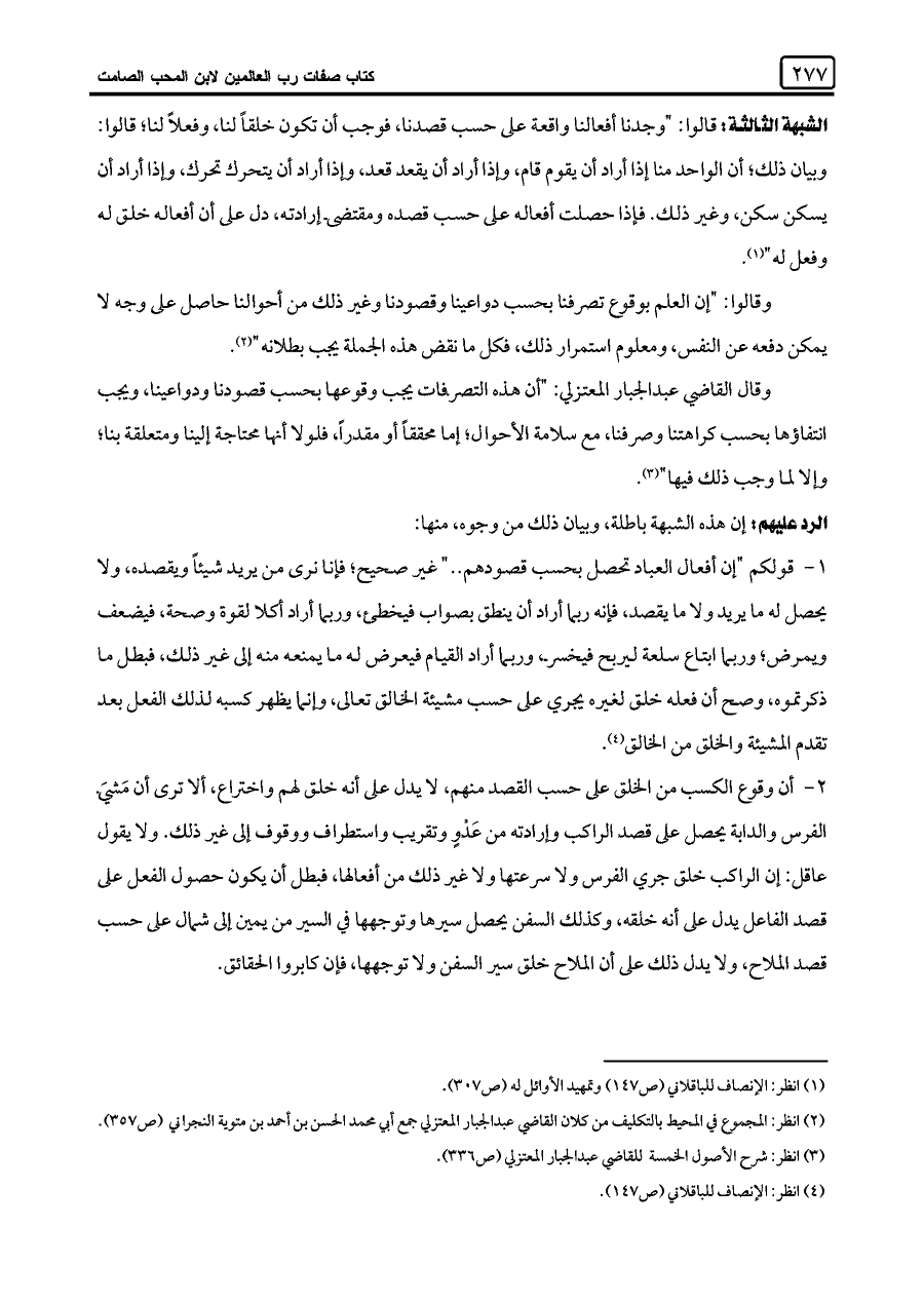 وقال القاضي عبد الجبار المعتزلي: "أن هذه التصرفات يجب وقوعها بحسب قصودنا ودواعينا، ويجب انتفاؤها بحسب كراهتنا وصرفنا، مع سلامة الأحوال؛ إما محققًا أو مقدرًا، فلولا أنها محتاجة إلينا ومتعلقة بنا؛ وإلا لما وجب ذلك فيها" (¬٣).
