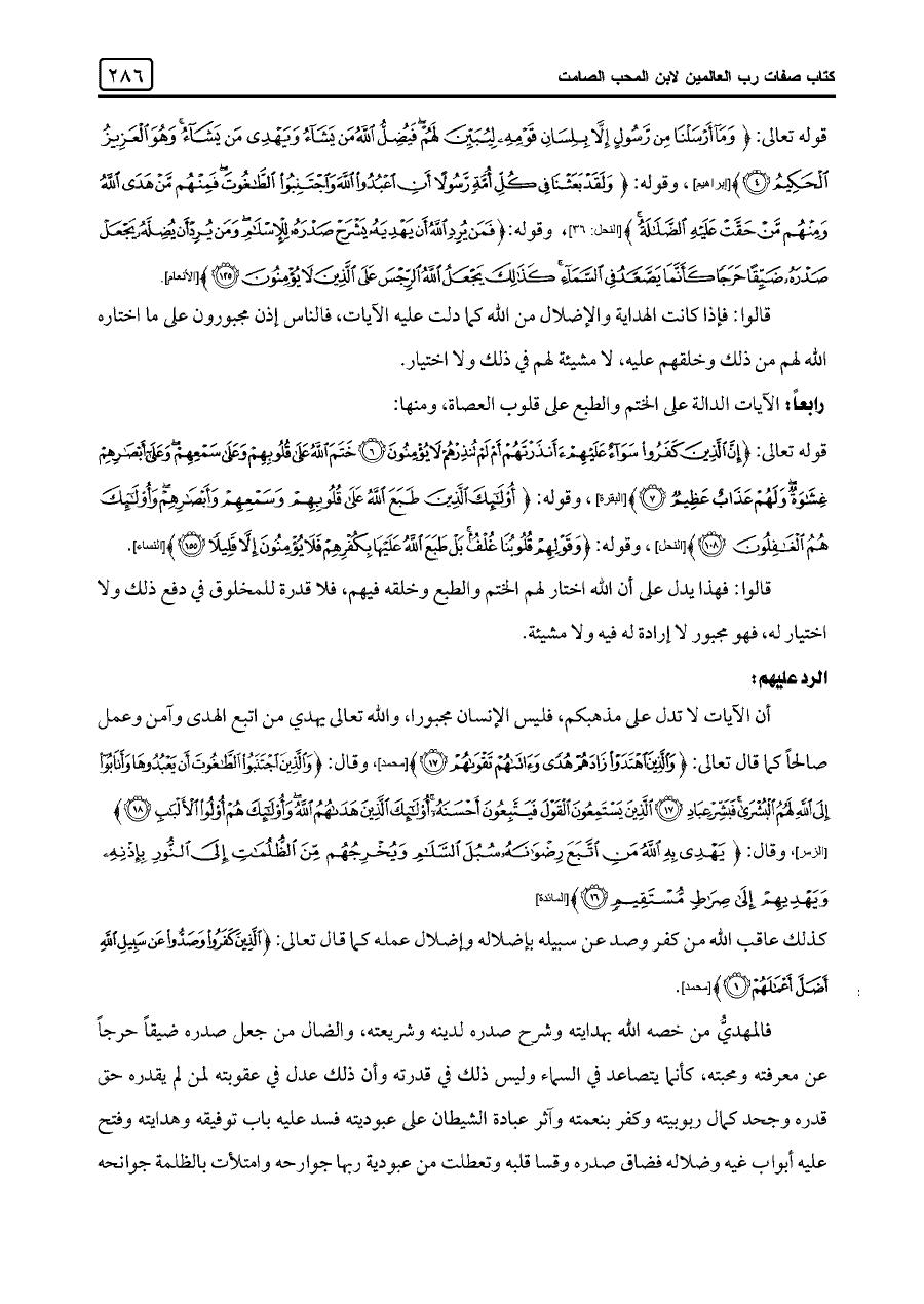 أن الآيات لا تدل على مذهبكم، فليس الإنسان مجبورا، واللَّه تعالى يهدي من اتبع الهدى وآمن وعمل صالحًا كما قال تعالى: {وَالَّذِينَ اهْتَدَوْا زَادَهُمْ هُدًى وَآتَاهُمْ تَقْوَاهُمْ (١٧)} [محمد]، وقال: {وَالَّذِينَ اجْتَنَبُوا الطَّاغُوتَ أَنْ يَعْبُدُوهَا وَأَنَابُوا إِلَى اللَّهِ لَهُمُ الْبُشْرَى فَبَشِّرْ عِبَادِ (١٧) الَّذِينَ يَسْتَمِعُونَ الْقَوْلَ فَيَتَّبِعُونَ أَحْسَنَهُ أُولَئِكَ الَّذِينَ هَدَاهُمُ اللَّهُ وَأُولَئِكَ هُمْ أُولُو الْأَلْبَابِ (١٨)} [الزمر]، وقال: {يَهْدِي بِهِ اللَّهُ مَنِ اتَّبَعَ رِضْوَانَهُ سُبُلَ السَّلَامِ وَيُخْرِجُهُمْ مِنَ الظُّلُمَاتِ إِلَى النُّورِ بِإِذْنِهِ وَيَهْدِيهِمْ إِلَى صِرَاطٍ مُسْتَقِيمٍ (١٦)} [المائدة].