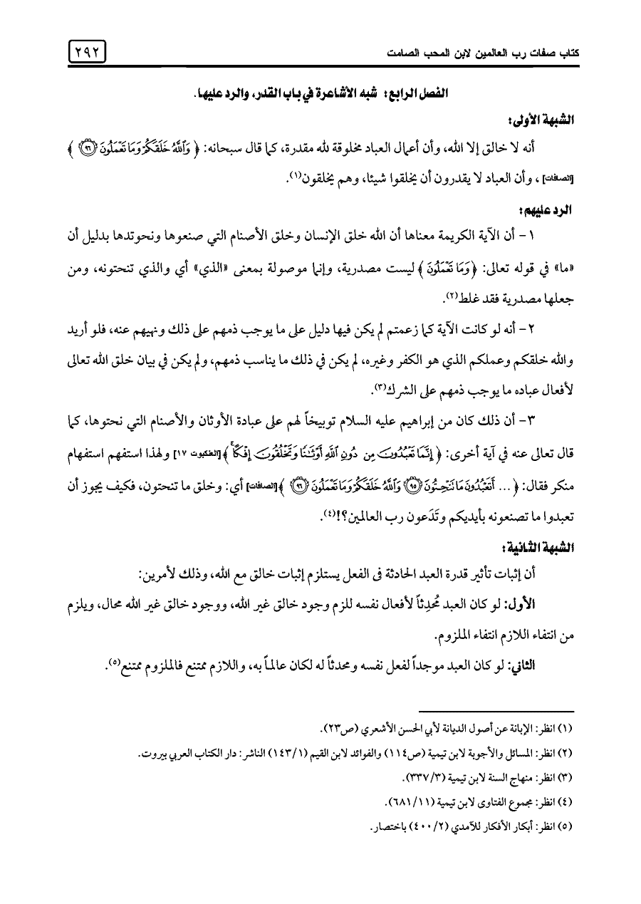 الفصل الرابع: شبه الأشاعرة في باب القدر، والرد عليها.