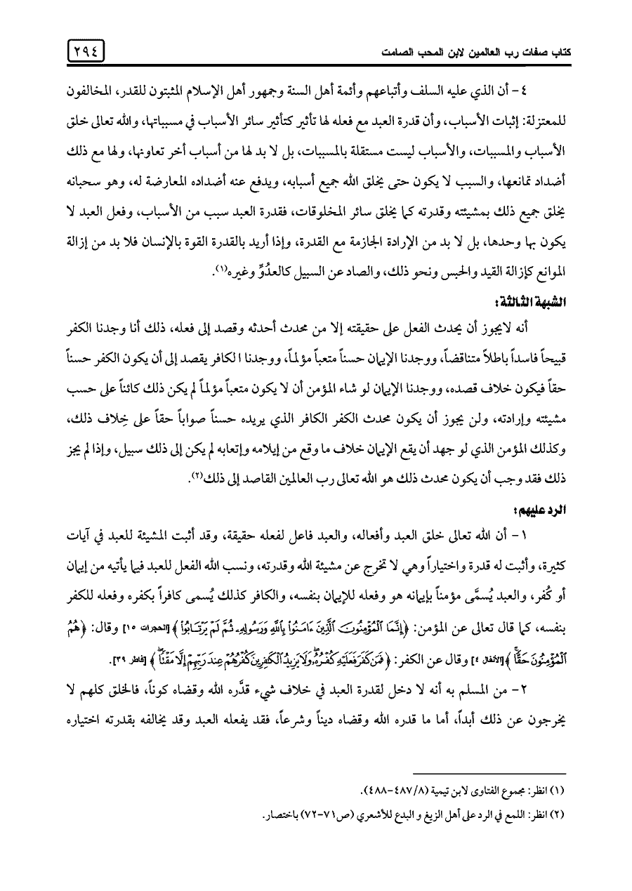 ٤ - أن الذي عليه السلف وأتباعهم وأئمة أهل السنة وجمهور أهل الإسلام المثبتون للقدر، المخالفون للمعتزلة: إثبات الأسباب، وأن قدرة العبد مع فعله لها تأثير كتأثير سائر الأسباب في مسبباتها، واللَّه تعالى خلق الأسباب والمسببات، والأسباب ليست مستقلة بالمسببات، بل لا بد لها من أسباب أخر تعاونها، ولها مع ذلك أضداد تمانعها، والسبب لا يكون حتى يخلق اللَّه جميع أسبابه، ويدفع عنه أضداده المعارضة له، وهو سبحانه يخلق جميع ذلك بمشيئته وقدرته كما يخلق سائر المخلوقات، فقدرة العبد سبب من الأسباب، وفعل العبد لا يكون بها وحدها، بل لا بد من الإرادة الجازمة مع القدرة، وإذا أريد بالقدرة القوة بالإنسان فلا بد من إزالة الموانع كإزالة القيد والحبس ونحو ذلك، والصاد عن السبيل كالعدُوِّ وغيره (¬١).