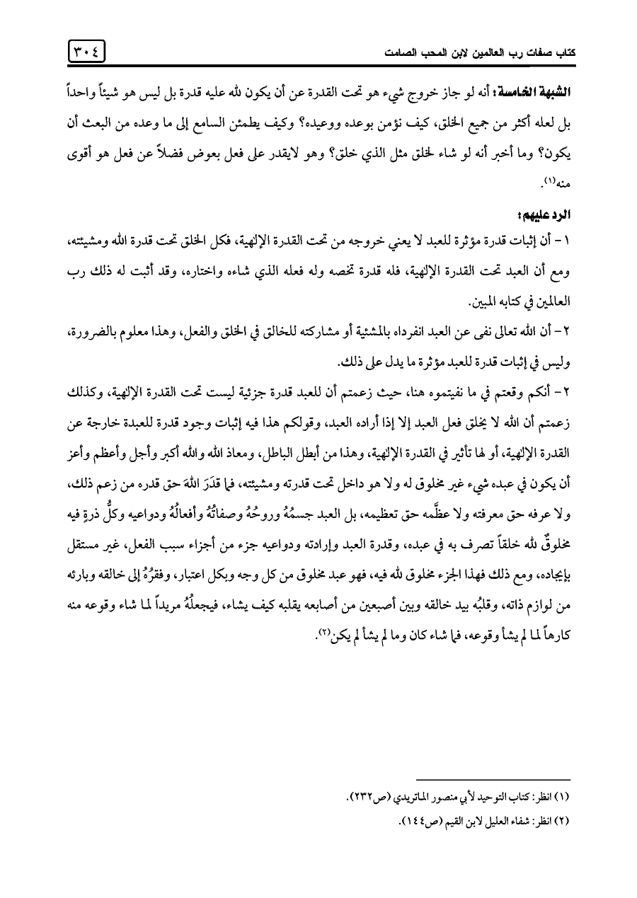 ٢ - أنكم وقعتم في ما نفيتموه هنا، حيث زعمتم أن للعبد قدرة جزئية ليست تحت القدرة الإلهية، وكذلك زعمتم أن اللَّه لا يحلق فعل العبد إلا إذا أراده العبد، وقولكم هذا فيه إثبات وجود قدرة للعبدة خارجة عن القدرة الإلهية، أو لها تأثير في القدرة الإلهية، وهذا من أبطل الباطل، ومعاذ اللَّه واللَّه أكبر وأجل وأعظم وأعز أن يكون في عبده شيء غير مخلوق له ولا هو داخل تحت قدرته ومشيئته، فما قَدَرَ اللَّهَ حق قدره من زعم ذلك، ولا عرفه حق معرفته ولا عظَّمه حق تعظيمه، بل العبد جسمُهُ وروحُهُ وصفاتُهُ وأفعالُهُ ودواعيه وكلُّ ذرةٍ فيه مخلوقٌ للَّه خلقًا تصرف به في عبده، وقدرة العبد وإرادته ودواعيه جزء من أجزاء سبب الفعل، غير مستقل بإيجاده، ومع ذلك فهذا الجزء مخلوق للَّه فيه، فهو عبد مخلوق من كل وجه وبكل اعتبار، وفقرُهُ إلى خالقه وبارئه من لوازم ذاته، وقلبُه بيد خالقه وبين أصبعين من أصابعه يقلبه كيف يشاء، فيجعلُهُ مريدًا لما شاء وقوعه منه كارهًا لما لم يشأ وقوعه، فما شاء كان وما لم يشأ لم يكن (¬٢).