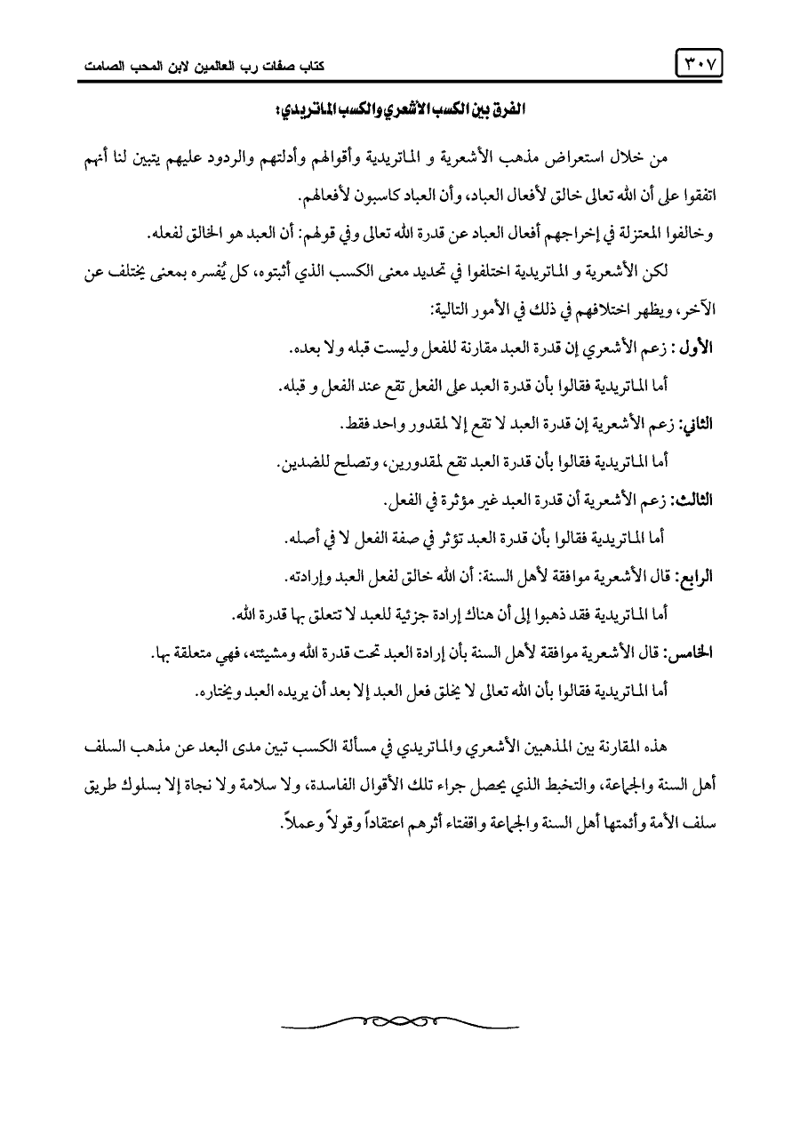 هذه المقارنة بين المذهبين الأشعري والماتريدي في مسألة الكسب تبين مدى البعد عن مذهب السلف أهل السنة والجماعة، والتخبط الذي يحصل جراء تلك الأقوال الفاسدة، ولا سلامة ولا نجاة إلا بسلوك طريق سلف الأمة وأئمتها أهل السنة والجماعة واقفتاء أثرهم اعتقادًا وقولًا وعملًا.