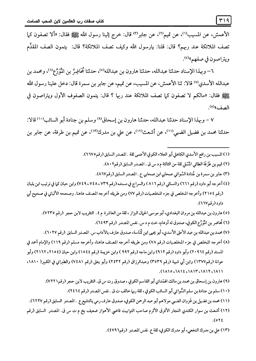 ٦ - وبهذا الإسناد حدثنا عبد اللَّه، حدثنا هارون بن عبد اللَّه (¬٥)، حدثنا مُحَاضِرُ بن المُوَرِّع (¬٦)، ومحمد بن عبد اللَّه الأسدي (¬٧) قالا: ثنا الأعمش، عن المسيب، عن تميم، عن جابر بن سمرة قال: دخل علينا رسول اللَّه -صلى اللَّه عليه وسلم-: فقال: "ما لكم لا تصفون كما تصف الملائكة عند ربها؟ قال: يتمون الصفوف الأول ويتراصون في الصف" (¬٨).