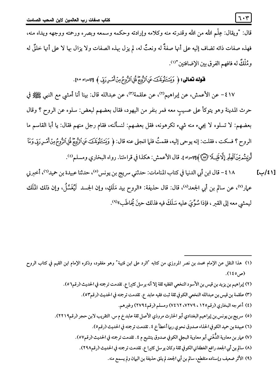 ٤١٧ - عن الأعمش، عن إبراهيم (¬٢)، عن علقمة (¬٣)، عن عبد اللَّه قال: بينا أنا أمشي مع النبي -صلى اللَّه عليه وسلم- في حرث المدينة وهو يتوكأ على عسيبٍ معه فمر بنفر من اليهود، فقال بعضهم لبعض: سلوه عن الروح؟ وقال بعضهم: لا تسلوه لا يجيء منه شيء تكرهونه، فقل بعضهم: لنسألنه، فقام رجل منهم فقال: يا أبا القاسم ما الروح؟ فسكت، فقلت: إنه يوحى إليه، فقمتُ فلما انجلى عنه قال: {وَيَسْأَلُونَكَ عَنِ الرُّوحِ قُلِ الرُّوحُ مِنْ أَمْرِ رَبِّي وَمَا أُوتِيتُمْ مِنَ الْعِلْمِ إِلَّا قَلِيلًا (٨٥)} [الإسراء]. قال الأعمش: هكذا في قراءتنا. رواه البخاري ومسلم (¬٤).