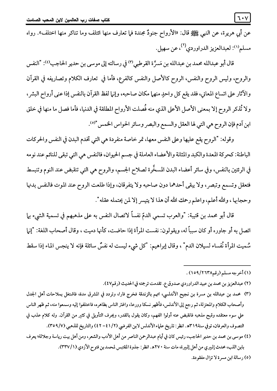 قال أبو عبد اللَّه محمد بن عبد اللَّه بن مَسرَّة القرطبي (¬٣) في رسالته إلى موسى بن حدير الحاجب (¬٤): "النفس والروح، وليس الروح والنفس، الروح كالأصل والنفس كالفرع، فأما في تعارف الكلام وتصاريفه في القرآن والآثار على اتساع المعاني، فقد يقع كل واحلي منهما مكان صاحبه، وإنها لفظ القرآن بالنفس إذا عنى أرواح البشر، ولا تُذكر الروح إلا بمعنى الأصل الأعلى الذي منه فُصلت الأرواح المطلقة في الدنيا، فأما فصل ما منها في خلق ابن آدم فإن الروح هي التي لها العقل والسمع والبصر وسائر الحواس الخمس" (¬٥).