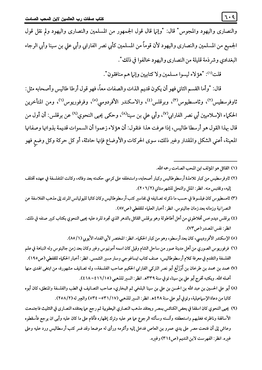 والنصارى واليهود والمجوس" قال: "وإنما قال قول الجمهور من المسلمين والنصارى واليهود ولم نقل قول الجميع من المسلمين والنصارى واليهود لأن قومًا من المسلمين كأبي نصر الفارابي وأبي علي بن سينا وأبي الرجاء البغدادي وشرذمة قليلة من النصارى واليهود خالفوا في ذلك".