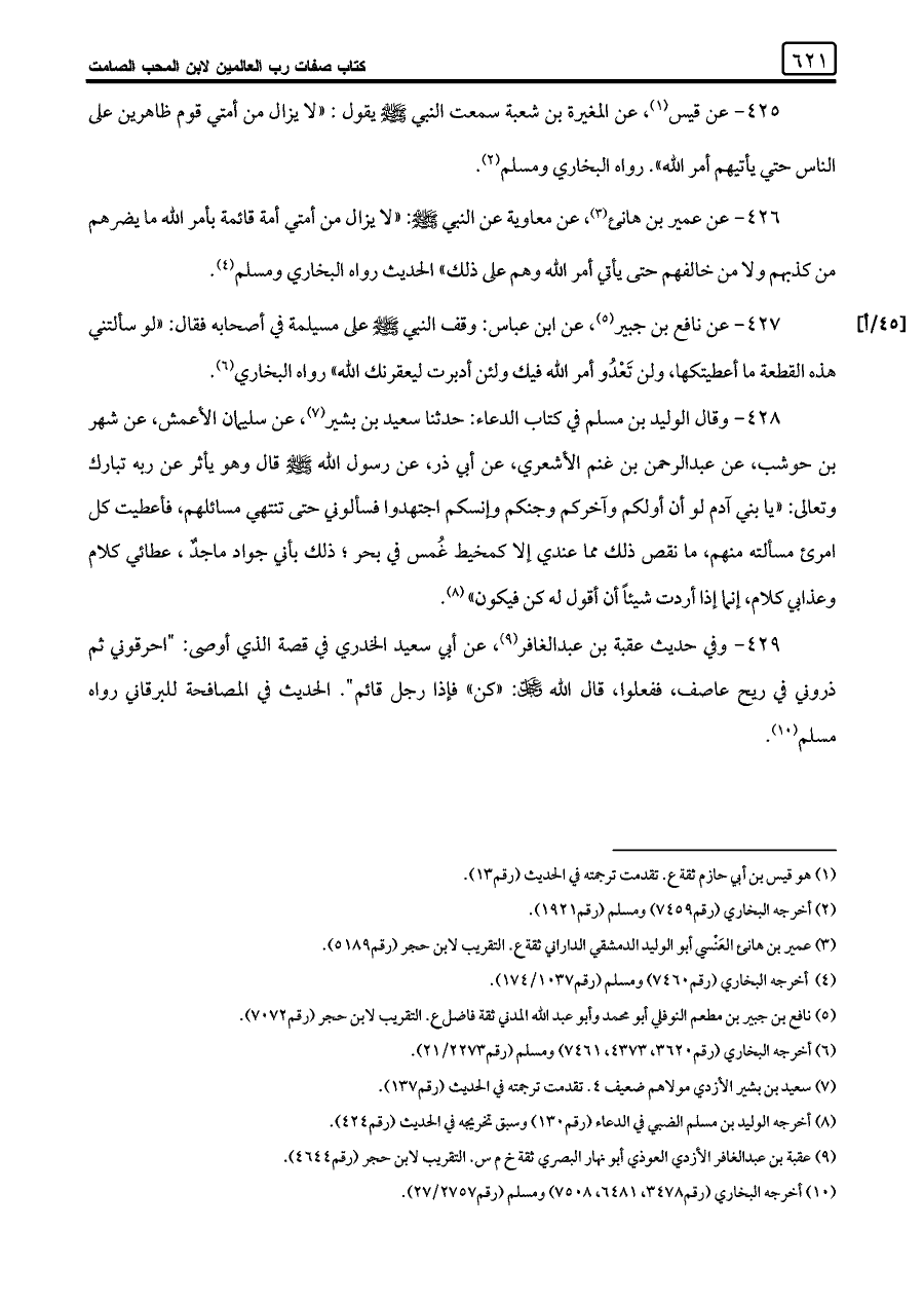 ٤٢٦ - عن عمير بن هانئ (¬٣)، عن معاوية عن النبي -صلى اللَّه عليه وسلم-: "لا يزال من أمتي أمة قائمة بأمر اللَّه ما يضرهم من كذبهم ولا من خالفهم حتى يأتي أمر اللَّه وهم على ذلك" الحديث رواه البخاري ومسلم (¬٤).