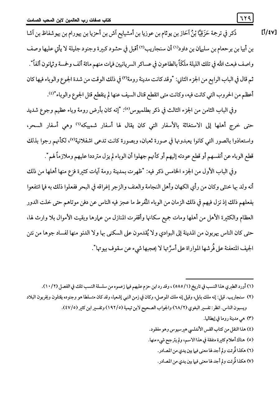 ذَكر في ترجمة حَزَقِيَّا بْنُ آحَاز بن يوثام بن عوزيا بن أمشيايع آش بن أحزيا بن يهورام بن يهوشفاظ بن آشا بن أبيا بن برحمام بن سليمان بن داود (¬١) أن سنجاريب (¬٢) أقبل في حشود كبيرة وجنود جليلة لا يأتي عليها وصف واصف فبعث اللَّه في تلك الليلة ملَكًا بالطاعون في عساكر السريانيين فيات منهم مائة ألف وخمسة وثمانون ألفًا". ثم قال في الباب الرابع من الجزء الثاني: "وقد كانت مدينة رومة (¬٣) في ذلك الوقت من شدة الجوع والوباء فيها كان أعظم من الحروب التي كانت فيه، وكانت متى انقطع قتال السيف عنها لم ينقطع قتل الجوع والوباء" (¬٤).