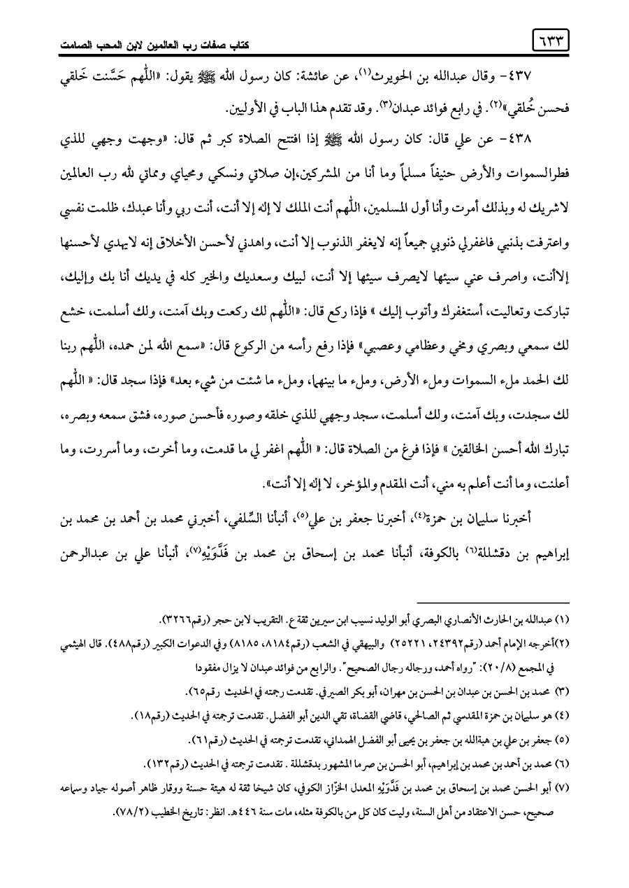 ٤٣٧ - وقال عبد اللَّه بن الحويرث (¬١)، عن عائشة: كان رسول اللَّه -صلى اللَّه عليه وسلم- يقول: "اللهم حَسَّنت خَلقي فحسن خُلقي" (¬٢). في رابع فوائد عبدان (¬٣). وقد تقدم هذا الباب في الأوليين.
