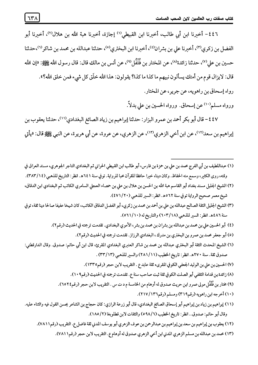 ٤٤٦ - أخبرنا ابن أبي طالب، أخبرنا ابن القبيطي (¬١) إجازة، أخبرنا هبة اللَّه بن هلال (¬٢)، أخبرنا أبو الفضل بن زكري (¬٣)، أخبرنا علي بن بشران (¬٤)، أخبرنا ابن البختري (¬٥)، حدثنا عبد اللَّه بن محمد بن شاكر (¬٦)، حدثنا حسين بن علي (¬٧)، حدثنا زائدة (¬٨)، عن المختار بن فُلْفُل (¬٩)، عن أنس بن مالك قال: قال رسول اللَّه -صلى اللَّه عليه وسلم-: "إن اللَّه قال: لا يزال قوم من أمتك يسألون نبيهم ما كذا ما كذا؟ يقولون: هذا اللَّه خلق كل شيء فمن خلق اللَّه؟ ".