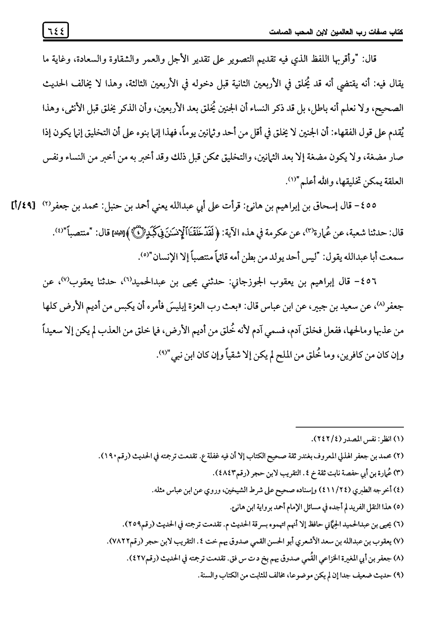 ٤٥٥ - قال إسحاق بن إبراهيم بن هانئ: قرأت على أبي عبد اللَّه يعني أحمد بن حنبل: محمد بن جعفر (¬٢) قال: حدثنا شعبة، عن عُمارة (¬٣)، عن عكرمة في هذه الآية: {لَقَدْ خَلَقْنَا الْإِنْسَانَ فِي كَبَدٍ (٤)} [البلد] قال: "منتصبًا" (¬٤). سمعت أبا عبد اللَّه يقول: "ليس أحد يولد من بطن أمه قائمًا منتصبًا إلا الإنسان" (¬٥).