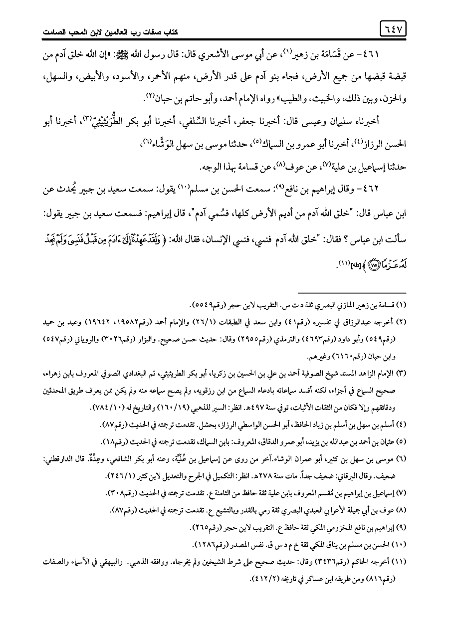 ٤٦١ - عن قَسَامَة بن زهير (¬١)، عن أبي موسى الأشعري قال: قال رسول اللَّه -صلى اللَّه عليه وسلم-: "إن اللَّه خلق آدم من قبضة قبضها من جميع الأرض، فجاء بنو آدم على قدر الأرض، منهم الأحمر، والأسود، والأبيض، والسهل، والحزن، وبين ذلك، والخبيث، والطيب" رواه الإمام أحمد، وأبو حاتم بن حبان (¬٢).