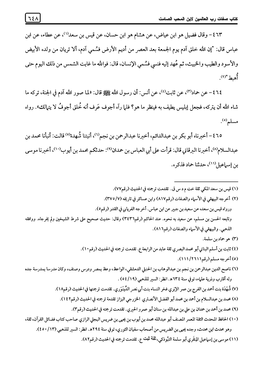 ٤٦٥ - أخبرناه أبو بكر بن عبد الدائم، أخبرنا عبد الرحمن بن نجم (¬٦)، أنبئتنا شُهدة (¬٧) قالت: أنبأنا محمد بن عبد السلام (¬٨)، أخبرنا البرقاني قال: قرأت على أبي العباس بن حمدان (¬٩): حدثكم محمد بن أيوب (¬١٠)، أخبرنا موسى بن إسماعيل (¬١١)، حدثنا حماد فذكره.