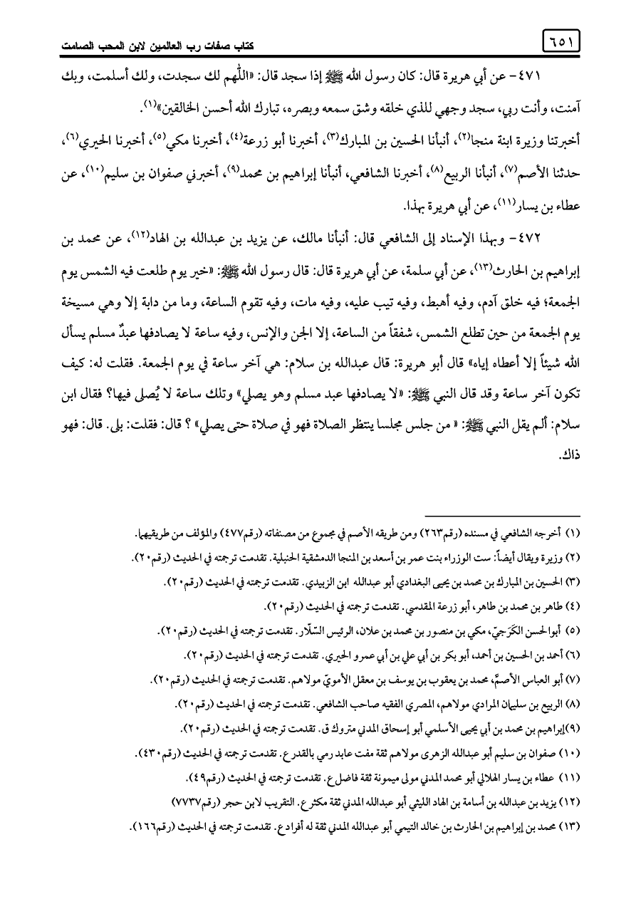 ٤٧٢ - وبهذا الإسناد إلى الشافعي قال: أنبأنا مالك، عن يزيد بن عبد اللَّه بن الهاد (¬١٢)، عن محمد بن إبراهيم بن الحارث (¬١٣)، عن أبي سلمة، عن أبي هريرة قال: قال رسول اللَّه -صلى اللَّه عليه وسلم-: "خير يوم طلعت فيه الشمس يوم الجمعة؛ فيه خلق آدم، وفيه أهبط، وفيه تيب عليه، وفيه مات، وفيه تقوم الساعة، وما من دابة إلا وهي مسيخة يوم الجمعة من حين تطلع الشمس، شفقًا من الساعة، إلا الجن والإنس، وفيه ساعة لا يصادفها عبدٌ مسلم يسأل اللَّه شيئًا إلا أعطاه إياه" قال أبو هريرة: قال عبد اللَّه بن سلام: هي آخر ساعة في يوم الجمعة. فقلت له: كيف تكون آخر ساعة وقد قال النبي -صلى اللَّه عليه وسلم-: "لا يصادفها عبد مسلم وهو يصلي" وتلك ساعة لا يُصلى فيها؟ فقال ابن سلام: ألم يقل النبي -صلى اللَّه عليه وسلم-: "من جلس مجلسا ينتظر الصلاة فهو في صلاة حتى يصلي"؟ قال: فقلت: بلى. قال: فهو ذاك.