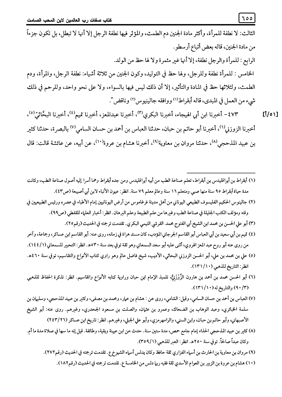 (¬٢) جالينوس الحكيم الفليسوف الطبيعي اليوناني من أهل مدينة فرغاموس من أرض اليونانيين إمام الأطباء في عصره ورئيس الطبيعيين في وقته ومؤلف الكتب الجليلة في صناعة الطب وغيرها من علم الطبيعة وعلم البرهان. انظر: أخبار العلماء للقفطي (ص ٩٩).