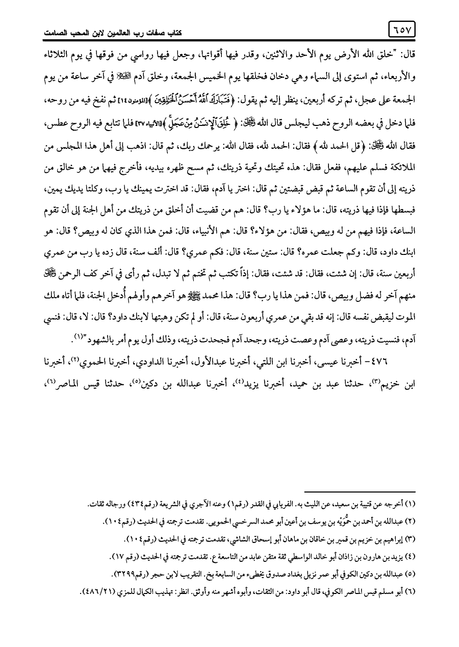 قال: "خلق اللَّه الأرض يوم الأحد والاثنين، وقدر فيها أقواتها، وجعل فيها رواسي من فوقها في يوم الثلاثاء والأربعاء، ثم استوى إلى السماء وهي دخان فخلقها يوم الخميس الجمعة، وخلق آدم عليه السلام في آخر ساعة من يوم الجمعة على عجل، ثم تركه أربعين، ينظر إليه ثم يقول: {فَتَبَارَكَ اللَّهُ أَحْسَنُ الْخَالِقِينَ} [المؤمنون: ١٤] ثم نفخ فيه من روحه، فلما دخل في بعضه الروح ذهب ليجلس قال اللَّه عز وجل: {خُلِقَ الْإِنْسَانُ مِنْ عَجَلٍ} [الأنبياء: ٣٧] فلما تتابع فيه الروح عطس، فقال اللَّه عز وجل: {قُلِ الْحَمْدُ لِلَّهِ} فقال: الحمد للَّه، فقال اللَّه: يرحمك ربك، ثم قال: اذهب إلى أهل هذا المجلس من الملائكة فسلم عليهم، ففعل فقال: هذه تحيتك وتحية ذريتك، ثم مسح ظهره بيديه، فأخرج فيهما من هو خالق من ذريته إلى أن تقوم الساعة ثم قبض قبضتين ثم قال: اختر يا آدم، فقال: قد اخترت يمينك يا رب، وكلتا يديك يمين، فبسطها فإذا فيها ذريته، قال: ما هؤلاء يا رب؟ قال: هم من قضيت أن أخلق من ذريتك من أهل الجنة إلى أن تقوم الساعة، فإذا فيهم من له وبيص، فقال: من هؤلاء؟ قال: هم الأنبياء، قال: فمن هذا الذي كان له وبيص؟ قال: هو ابنك داود، قال: وكم جعلت عمره؟ قال: ستين سنة، قال: فكم عمري؟ قال: ألف سنة، قال زده يا رب من عمري أربعين سنة، قال: إن شئت، فقال: قد شئت، فقال: إذًا تكتب ثم تختم ثم لا تبدل، ثم رأى في آخر كف الرحمن عز وجل منهم آخر له فضل وبيص، قال: فمن هذا يا رب؟ قال: هذا محمد -صلى اللَّه عليه وسلم- هو آخرهم وأولهم أُدخل الجنة، فلما أتاه ملك الموت ليقبض نفسه قال: إنه قد بقي من عمري أربعون سنة، قال: أو لم تكن وهبتها لابنك داود؟ قال: لا، قال: فنسي آدم، فنسيت ذريته، وعصى آدم وعصت ذريته، وجحد آدم فجحدت ذريته، وذلك أول يوم أمر بالشهود" (¬١).
