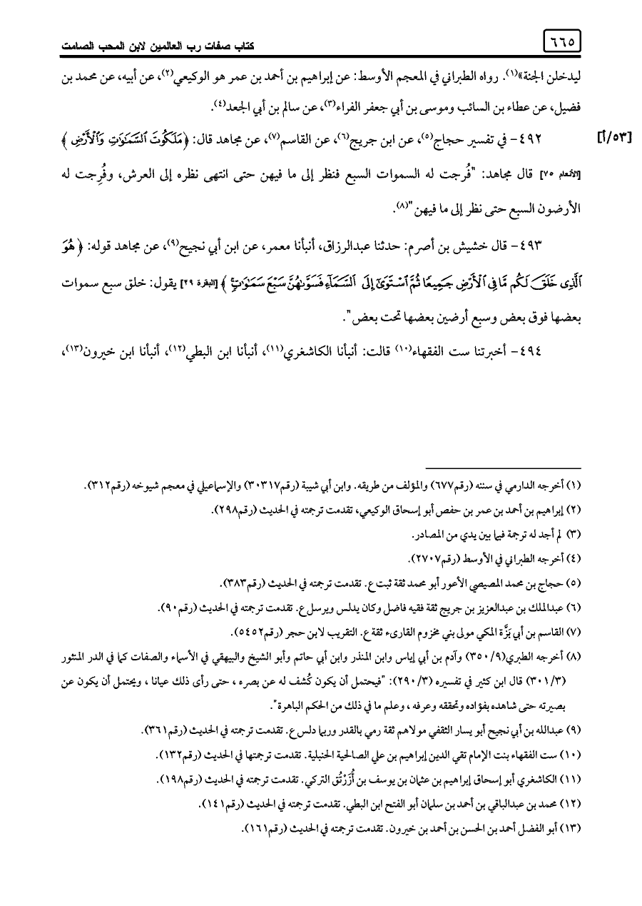 ٤٩٢ - في تفسير حجاج (¬٥)، عن ابن جريج (¬٦)، عن القاسم (¬٧)، عن مجاهد قال: {مَلَكُوتِ السَّمَاوَاتِ وَالْأَرْضِ} [الأنعام: ٧٥] قال مجاهد: "فُرجت له السموات السبع فنظر إلى ما فيهن حتى انتهى نظره إلى العرش، وفُرِجت له الأرضون السبع حتى نظر إلى ما فيهن" (¬٨).