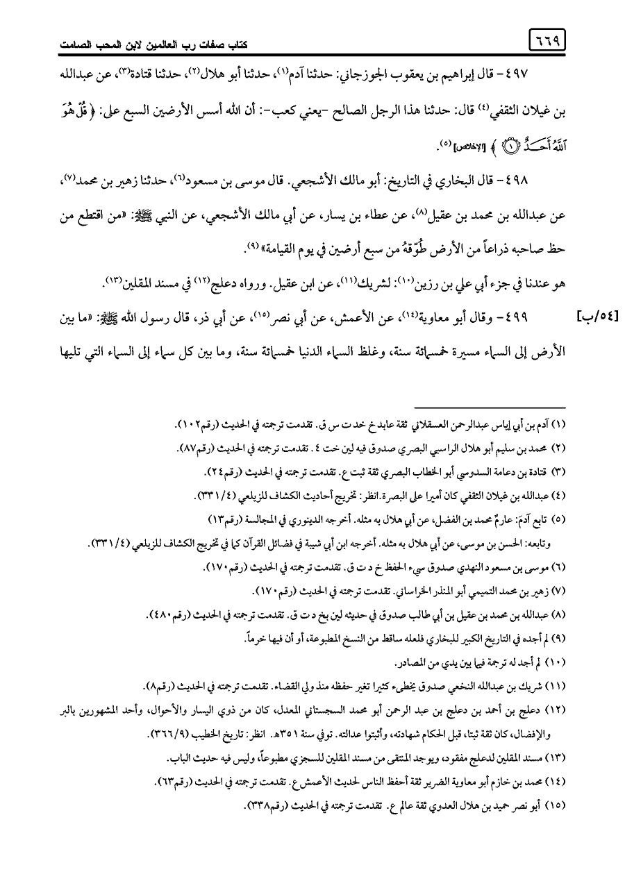 ٤٩٧ - قال إبراهيم بن يعقوب الجوزجاني: حدثنا آدم (¬١)، حدثنا أبو هلال (¬٢)، حدثنا قتادة (¬٣)، عن عبد اللَّه بن غيلان الثقفي (¬٤) قال: حدثنا هذا الرجل الصالح -يعني كعب-: أن اللَّه أسس الأرضين السبع على: {قُلْ هُوَ اللَّهُ أَحَدٌ (١)} [الإخلاص] (¬٥).