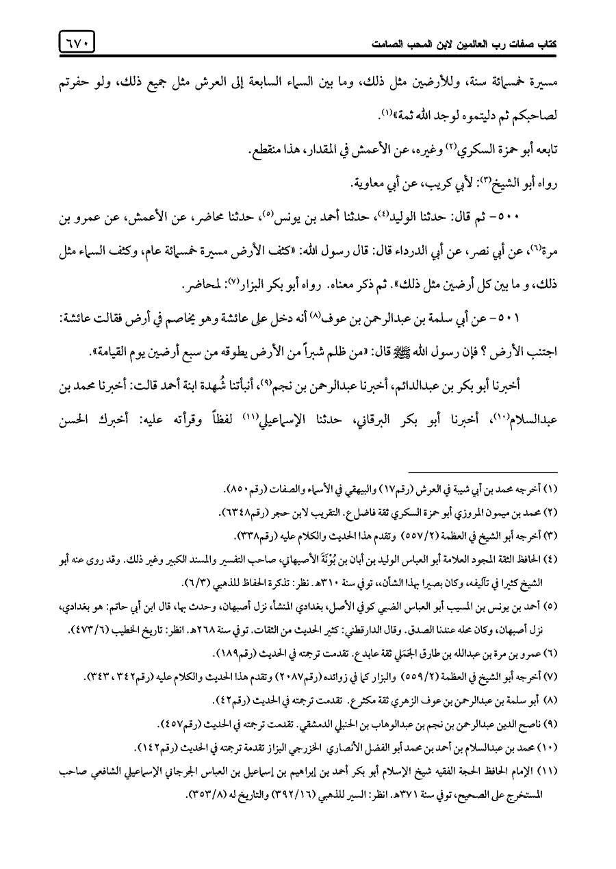 ٥٠٠ - ثم قال: حدثنا الوليد (¬٤)، حدثنا أحمد بن يونس (¬٥)، حدثنا محاضر، عن الأعمش، عن عمرو بن مرة (¬٦)، عن أبي نصر، عن أبي الدرداء قال: قال رسول اللَّه: "كثف الأرض مسيرة خمسمائة عام، وكثف السماء مثل ذلك، وما بين كل أرضين مثل ذلك". ثم ذكر معناه. رواه أبو بكر البزار (¬٧): لمحاضر.