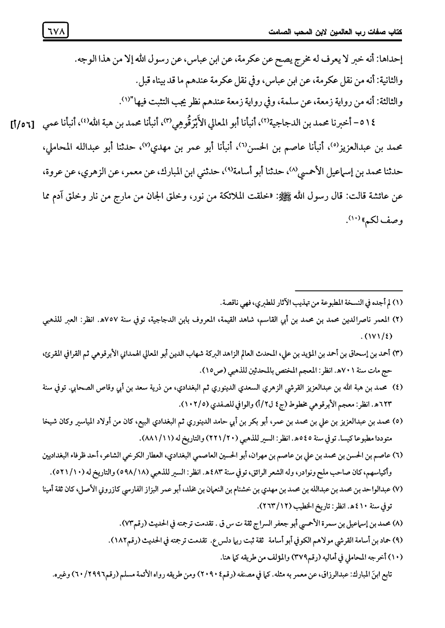 ٥١٤ - أخبرنا محمد بن الدجاجية (¬٢)، أنبأنا أبو المعالي الأَبْرَقُوهِي (¬٣)، أنبأنا محمد بن هبة اللَّه (¬٤)، أنبأنا عمي محمد بن عبد العزيز (¬٥)، أنبأنا عاصم بن الحسن (¬٦)، أنبأنا أبو عمر بن مهدي (¬٧)، حدثنا أبو عبد اللَّه المحاملي، حدثنا محمد بن إسماعيل الأحمسي (¬٨)، حدثنا أبو أسامة (¬٩)، حدثني ابن المبارك، عن معمر، عن الزهري، عن عروة، عن عائشة قالت: قال رسول اللَّه -صلى اللَّه عليه وسلم-: "خلقت الملائكة من نور، وخلق الجان من مارج من نار وخلق آدم مما وصف لكم" (¬١٠).