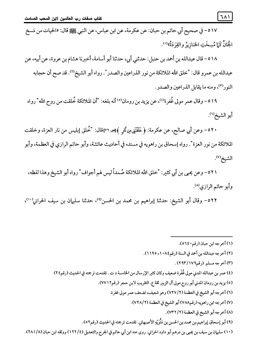 ٥١٨ - قال عبد اللَّه بن أحمد بن حنبل: حدثني أبي، حدثنا أبو أسامة، أخبرنا هشام بن عروة، عن أبيه، عن عبد اللَّه بن عمرو قال: "خلق اللَّه الملائكة من نور الذراعين والصدر". رواه أبو الشيخ (¬٢). قد صح أن حجابه النور (¬٣)، ومنه ما يقابل الذراعين والصدر.