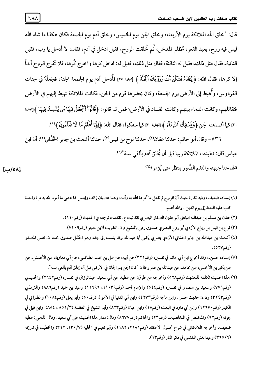 (¬١) إسناده ضعيف، وفيه نكارة حيث أن الروح لم تفعل ما أمرها اللَّه به وأبت وهذا عصيان زائد، وإبلس لما عصى ما أمره اللَّه به مرة واحدة كتب عليه اللعنة إلى يوم الدين. واللَّه أعلم.