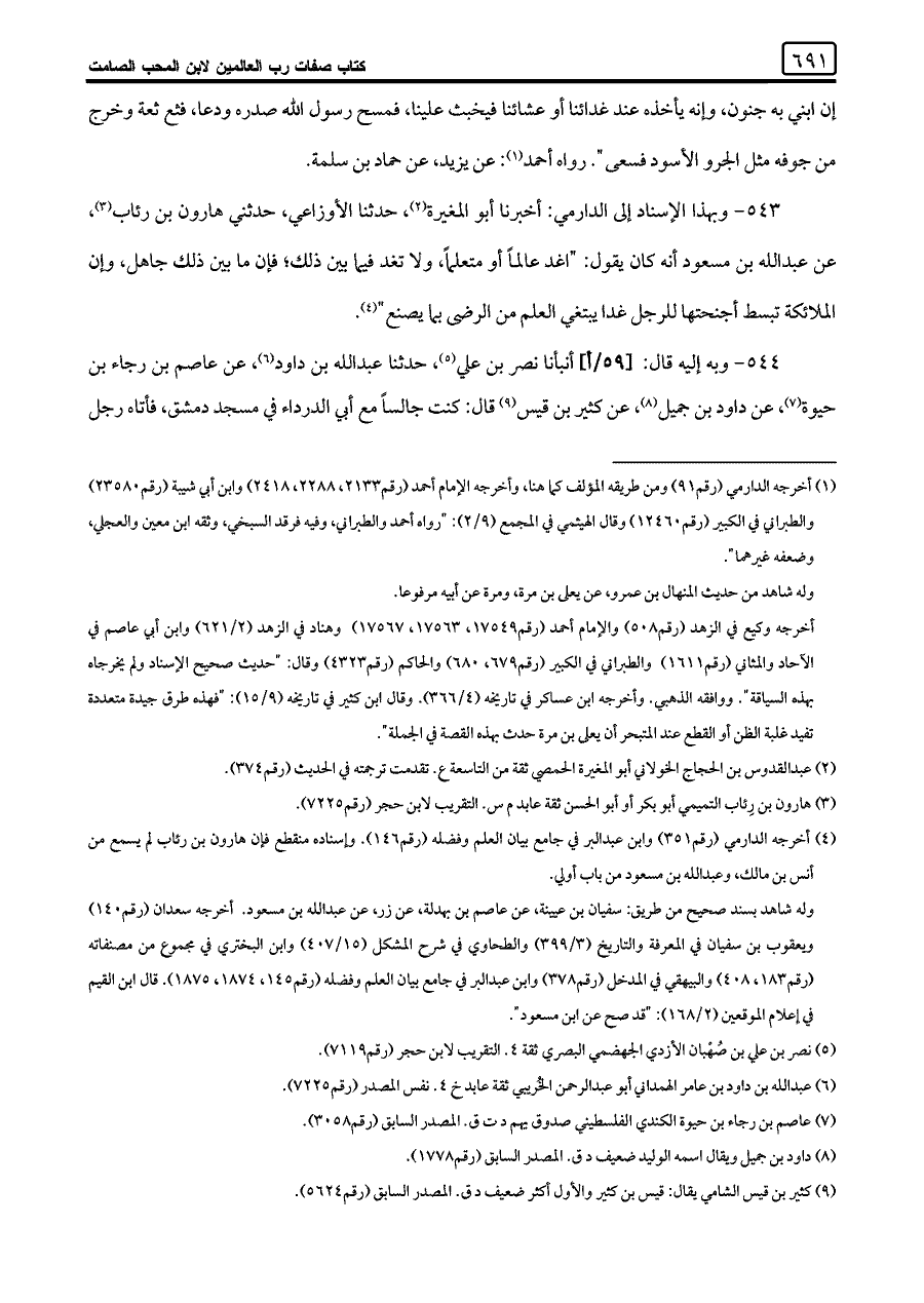 ٥٤٣ - وبهذا الإسناد إلى الدارمي: أخبرنا أبو المغيرة (¬٢)، حدثنا الأوزاعي، حدثني هارون بن رئاب (¬٣)، عن عبد اللَّه بن مسعود أنه كان يقول: "اغد عالمًا أو متعلمًا، ولا تغد فيما بين ذلك؛ فإن ما بين ذلك جاهل، وإن الملائكة تبسط أجنحتها للرجل غدا يبتغي العلم من الرضى بما يصنع" (¬٤).