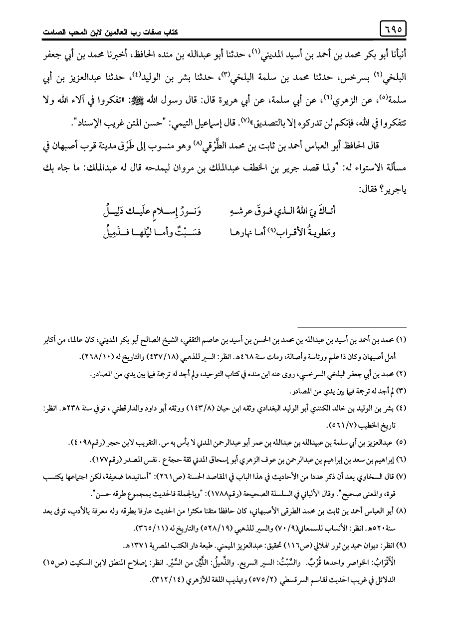 قال الحافظ أبو العباس أحمد بن ثابت بن محمد الطَّرْقي (¬٨) وهو منسوب إلى طَرْق مدينة قرب أصبهان في مسألة الاستواء له: "ولما قصد جرير بن الخطف عبد الملك بن مروان ليمدحه قال له عبد الملك: ما جاء بك يا جرير؟ فقال: