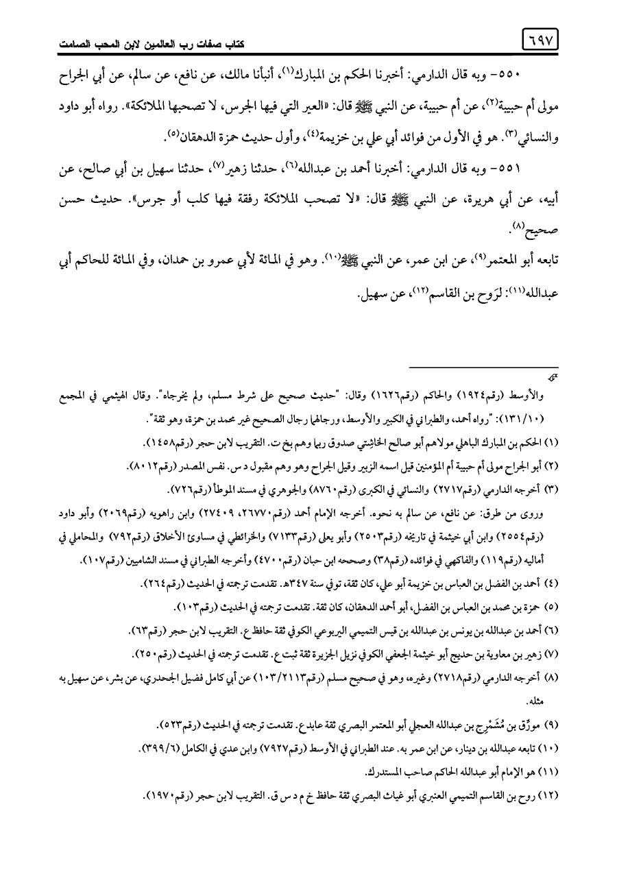 ٥٥٠ - وبه قال الدارمي: أخبرنا الحكم بن المبارك (¬١)، أنبأنا مالك، عن نافع، عن سالم، عن أبي الجراح مولى أم حبيبة (¬٢)، عن أم حبيبة، عن النبي -صلى اللَّه عليه وسلم- قال: "العير التي فيها الجرس، لا تصحبها الملائكة". رواه أبو داود والنسائي (¬٣). هو في الأول من فوائد أبي علي بن خزيمة (¬٤)، وأول حديث حمزة الدهقان (¬٥).