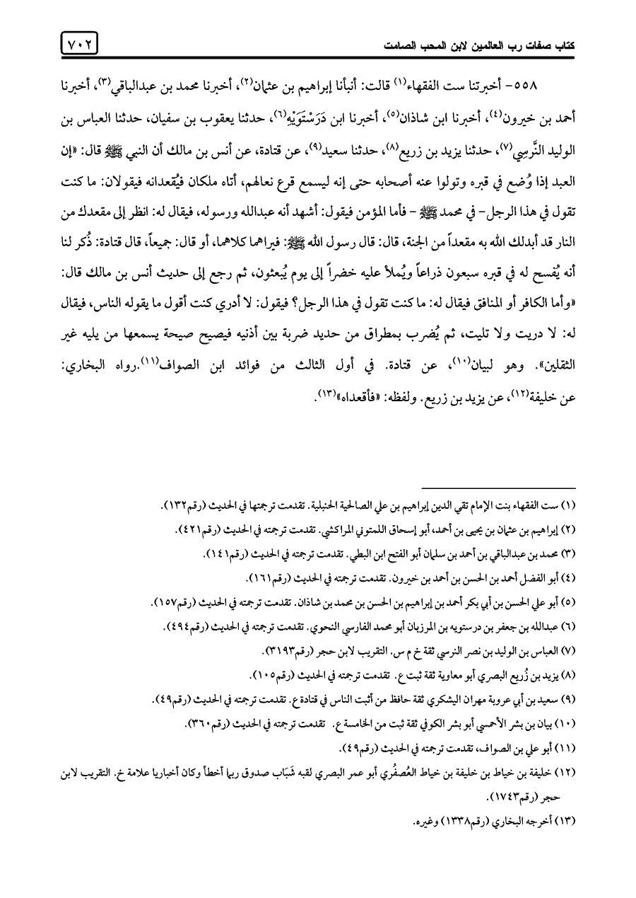 ٥٥٨ - أخبرتنا ست الفقهاء (¬١) قالت: أنبأنا إبراهيم بن عثمان (¬٢)، أخبرنا محمد بن عبد الباقي (¬٣)، أخبرنا أحمد بن خيرون (¬٤)، أخبرنا ابن شاذان (¬٥)، أخبرنا ابن دَرَسْتَوَيْهِ (¬٦)، حدثنا يعقوب بن سفيان، حدثنا العباس بن الوليد النَّرسِي (¬٧)، حدثنا يزيد بن زريع (¬٨)، حدثنا سعيد (¬٩)، عن قتادة، عن أنس بن مالك أن النبي -صلى اللَّه عليه وسلم- قال: "إن العبد إذا وُضع في قبره وتولوا عنه أصحابه حتى إنه ليسمع قرع نعالهم، أتاه ملكان فيُقعدانه فيقولان: ما كنت تقول في هذا الرجل -في محمد -صلى اللَّه عليه وسلم- فأما المؤمن فيقول: أشهد أنه عبد اللَّه ورسوله، فيقال له: انظر إلى مقعدك من النار قد أبدلك اللَّه به مقعدًا من الجنة، قال: قال رسول اللَّه -صلى اللَّه عليه وسلم-: فيراهما كلاهما، أو قال: جميعًا، قال قتادة: ذُكر لنا أنه يُفسح له في قبره سبعون ذراعًا ويُملأ عليه خضرًا إلى يوم يُبعثون، ثم رجع إلى حديث أنس بن مالك قال: "وأما الكافر أو المنافق فيقال له: ما كنت تقول في هذا الرجل؟ فيقول: لا أدري كنت أقول ما يقوله الناس، فيقال له: لا دريت ولا تليت، ثم يُضرب بمطراق من حديد ضربة بين أذنيه فيصيح صيحة يسمعها من يليه غير الثقلين". وهو لبيان (¬١٠)، عن قتادة. في أول الثالث من فوائد ابن الصواف (¬١١). رواه البخاري: عن خليفة (¬١٢)، عن يزيد بن زريع. ولفظه: "فأقعداه" (¬١٣).