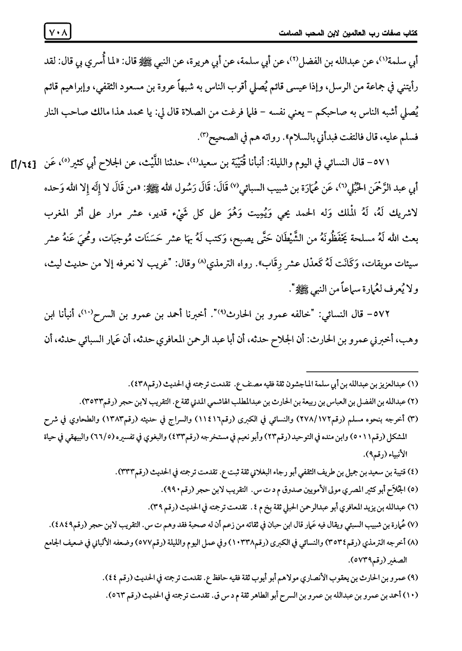 ٥٧١ - قال النسائي في اليوم والليلة: أنبأنا قُتَيْبَة بن سعيد (¬٤)، حدثنا اللَّيث، عن الجلاح أبي كثير (¬٥)، عَن أبي عبد الرَّحْمَن الحُبُلي (¬٦)، عَن عُمَارَة بن شبيب السبائي (¬٧) قَالَ: قَالَ رَسُول اللَّه -صلى اللَّه عليه وسلم-: "من قال لا إله إِلا اللَّه وحده لا شريك لَهُ، لَهُ الملك وَله الحمد يحيي وَيُمِيت وَهُوَ على كل شَيْء قدير، عشر مرار على أثر المغرب بعث اللَّه لَهُ مسلحة يَحْفَظُونَهُ من الشَّيْطَان حَتَّى يصبح، وَكتب لَهُ بهَا عشر حَسَنَات مُوجبَات، ومُحيَ عَنهُ عشر سيئات موبقات، وكَانَتْ له كَعدْل عشر رِقَاب". رواه الترمذي (¬٨) وقال: "غريب لا نعرفه إِلا من حديث ليث، ولا يُعرف لعُمارة سماعًا من النبي -صلى اللَّه عليه وسلم-".