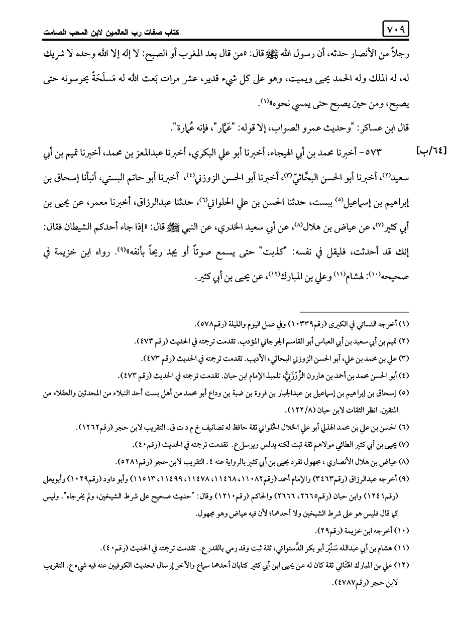 ٥٧٣ - أخبرنا محمد بن أبي الهيجاء، أخبرنا أبو علي البكري، أخبرنا عبد المعز بن محمد، أخبرنا تميم بن أبي سعيد (¬٢)، أخبرنا أبو الحسن البكائي (¬٣)، أخبرنا أبو الحسن الزوزني (¬٤)، أخبرنا أبو حاتم البستي، أنبأنا إسحاق بن إبراهيم بن إسماعيل (¬٥) ببست، حدثنا الحسن بن علي الحلواني (¬٦)، حدثنا عبد الرزاق، أخبرنا معمر، عن يحيى بن أبي كثير (¬٧)، عن عياض بن هلال (¬٨)، عن أبي سعيد الخدري، عن النبي -صلى اللَّه عليه وسلم- قال: "إذا جاء أحدكم الشيطان فقال: إنك قد أحدثت، فليقل في نفسه: "كذبت" حتى يسمع صوتًا أو يجد ريحًا بأنفه" (¬٩). رواه ابن خزيمة في صحيحه (¬١٠): لهشام (¬١١) وعلي بن المبارك (¬١٢)، عن يحيى بن أبي كثير.