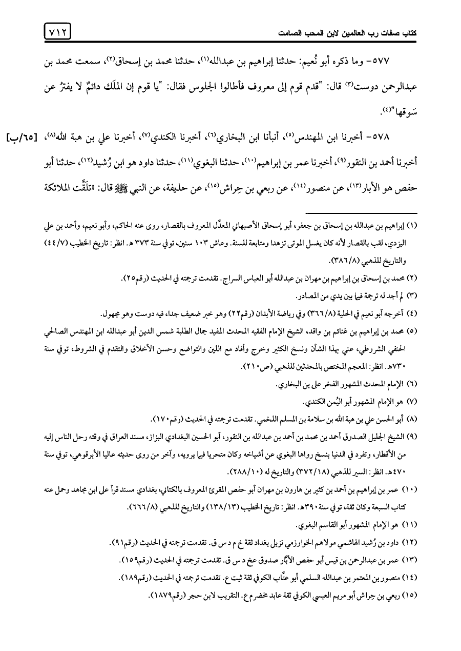 ٥٧٧ - وما ذكره أبو نُعيم: حدثنا إبراهيم بن عبد اللَّه (¬١)، حدثنا محمد بن إسحاق (¬٢)، سمعت محمد بن عبد الرحمن دوست (¬٣) قال: "قدم قوم إلى معروف فأطالوا الجلوس فقال: "يا قوم إن الملَك دائمٌ لا يفترُ عن سَوقها" (¬٤).